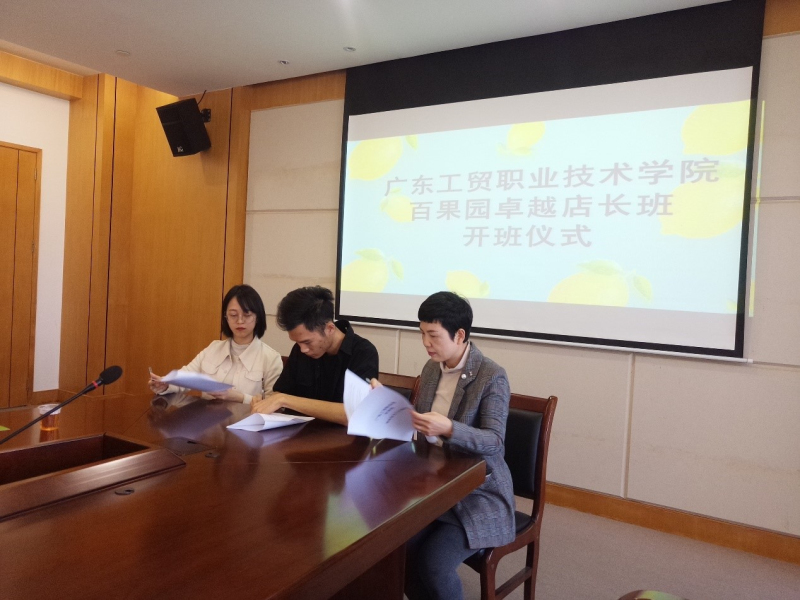 2019年12月26日,广东工贸工商管理学院百果园卓越店长班开班仪式在明德楼1区201中心会议室举行。参加此次开班仪式有工商管理学院党总支书记周清莲,副书记谢宏祥,工商管理学院副院长倪春丽,商业服务系主任何美贤、财税服务系主任邹建军、企业管理专业带头人袁年英、商务管理教师黄淑雯,以及百果园人力资源部副经理纪楚珊、人力资源部人事主管梁仲麟,参加讲座的学生共有16人。倪春丽担任本次仪式的主持并宣布卓越店长班开班仪式正式开始。