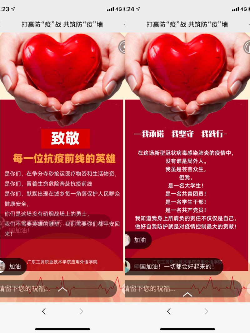 当前,新型冠状病毒感染肺炎疫情的防控工作正处于关键时期,为进一步引导同学们树立正确的防疫意识,严格阻止疫情传播蔓延,并落实传达《广东工贸职业技术学院关于2020年春季开学的通知》要求,应用外语学院开展“打赢防“疫”战 共筑防“疫”墙”签署疫情防控电子承诺书活动,倡议全院学生参与,全力打通疫情防控宣传“最后一公里”。
