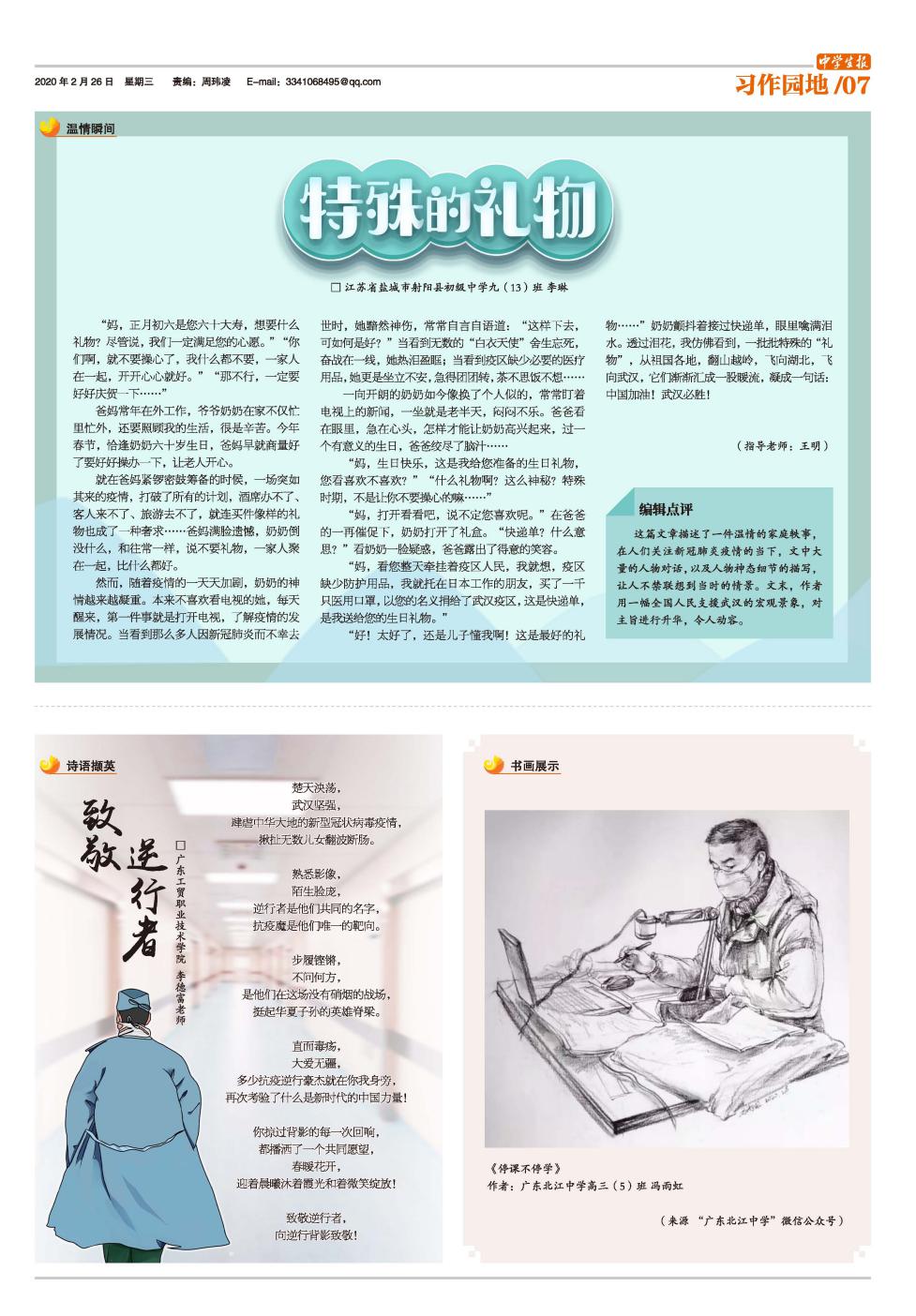 面对此次新冠肺炎疫情,我们大部分普通老百姓不能像逆行的白衣天使一样冲向抗疫一线,而只能宅在家里,但我们能以笔为“枪”,在家中向这场突如其来的疫情“开火”。2月26日,应用外语学院党总支书记李德富在《中学生报》刊登自创诗歌《致敬逆行者》,以文字向英雄致敬,为武汉祈福,为湖北祈福,为中国祈福!