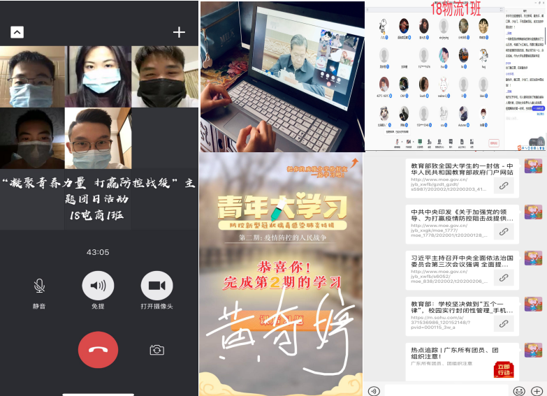 线上主题团日活动覆盖全校各班团支部,踊跃出许多特色暖心活动。如18工管4班团支部推出“防疫宅家干货”板块,每日推送学习强国文章到班群、党章学习小组群共同学习。又如17旅英1班于深圳中洲圣廷苑酒实习学生在自行隔离期间与公司联合开展校企防疫“送温情”活动。