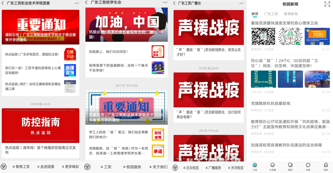 团学组织通过“新媒体矩阵”、第二课堂成绩单、信息信息发布系统、易班、线上广播台“五位一体”宣传平台积极推送科学防控、心理咨询、倡议承诺、返学通告等防疫动态宣传,及时传递《教育部致全国大学生的一封信》、《行动令!各级共青团组织团干部和团员青年们:立即行动,投身疫情防控》、《致工贸学子的一封信》、《新冠肺炎防控知识手册》等信息,增强群防群控的自觉性,提高学生防范的警惕性。