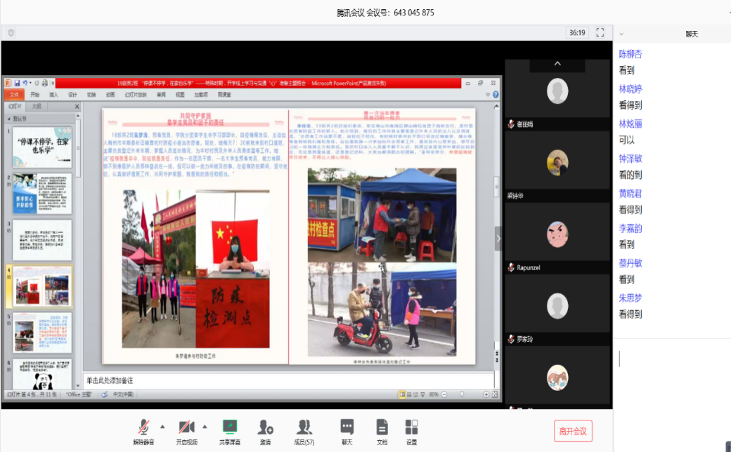为进一步做好疫情防控工作,保障全学院师生生命健康安全,近日,在学生处的统一安排下,应用外语学院召集各班级将疫情防控与思想政治教育相结合,利用网络新媒体技术,开展了形式多样、内容丰富的“云端”主题班会。大家在疫情防控感想与交流,做好“心”准备,积极关注、精神抖擞地迎接新学期。