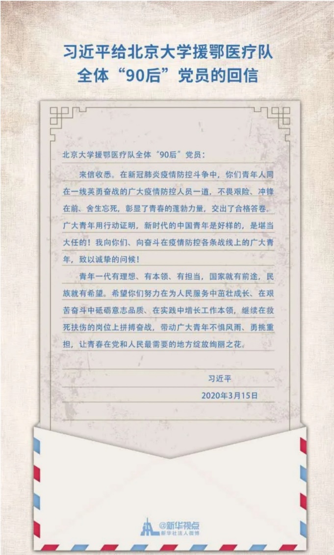 课堂伊始,邱秀芳与同学们分享了3月18日人民日报文章《中国抗疫体现大国担当》,同时解读了习近平总书记在3月15日给北京大学援鄂医疗队全体“90后”党员回信。