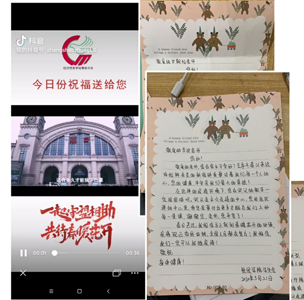 此外,一封封写满祝福和感恩的信,《我们等您》、《老师,与你共踏校园 课堂上共聚》的暖人视频,也同一时间寄去了思念。全体经贸师生用实际行动给身在湖北的两位老师送去了意外惊喜和无限感动。病毒无情,人心温暖,早日团聚是经贸师生们共同的心声。
