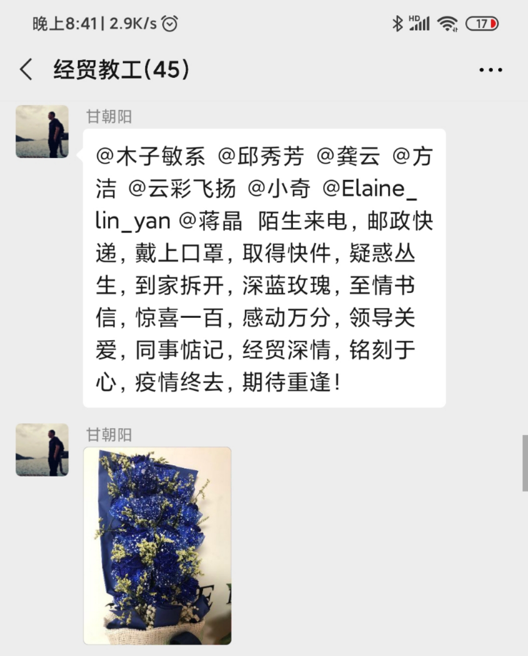 3月20日,一个意外的快递电话,让身处武汉的两位老师困惑不已。当他们拿到手拆开盒子后,惊喜的发现,19朵象征欢乐的蓝色玫瑰意外地呈现在他们面前。“陌生来电,邮政快递,戴上口罩,取得快件,疑惑丛生,到家拆开,深蓝玫瑰,至情书信,惊喜一百,感动万分,领导关爱,同事惦记,经贸深情,铭刻于心,疫情终去,期待重逢!”甘朝阳老师在收到鲜花后第一时间激动地表达了自己的情感。