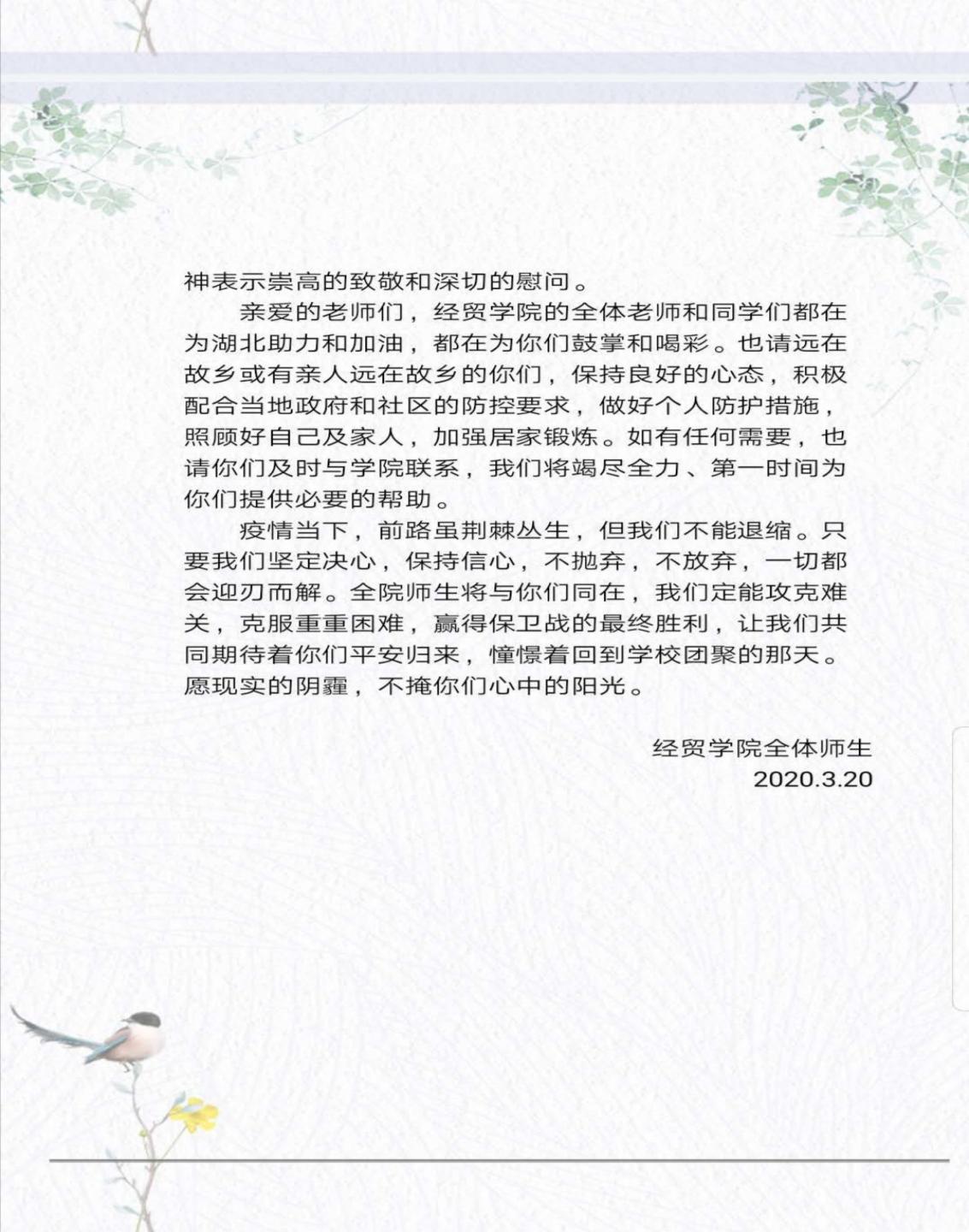 “全院师生将与你们同在,我们定能攻克难关,克服重重困难,赢得最终胜利,让我们共同期待着你们的平安归来,憧憬着回到学校团聚的那天,经贸学院永远是你们温暖的家。”
