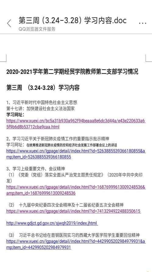 疫情防控期间,支部在强调党员教师做好个人防控,线上教学本职工作的同时,也不松懈于党员政治学习。3月24日-28日期间,蒋晶向支部党员传达了学校《新冠肺炎防控学习通知》,并发布支部政治学习内容清单。支部党员纷纷响应,在家开展政治学习,并撰写学习心得。