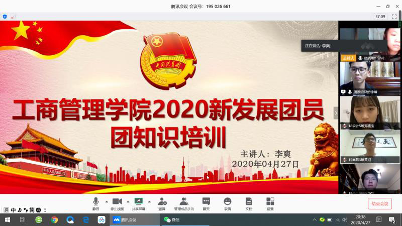 为深入贯彻落实习近平新时代中国特色社会主义思想,扎实推进工商管理学院团员发展和教育工作,充分发挥团组织的教育职能,把培养教育青年一代团员的任务落到实处,培育有理想、有文化、有道德、有纪律的社会主义事业接班人,使我院共青团组织更好成为团结教育全院青年团员的坚强核心。2020年4月27日晚,工商管理学院针对本学期拟发展团员开展了视频团课,主讲人为团委书记李爽,组织部部长冼静雅,副部长钟瀚以及全体拟发展团员参加了本次学习活动。