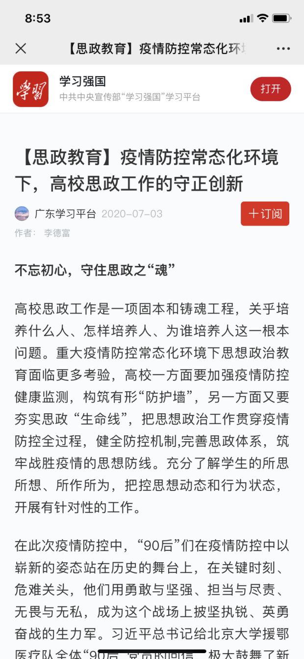 7月3日,学习强国广东学习平台【思政教育】专题转发我校外语学院党总支书记李德富文章《疫情防控常态化环境下,高校思政工作的守正创新》,文章以“不忘初心,守住思政之‘魂’”、“创新模式,打造思政之‘新’”、“改进攻击,淬炼思政之‘源’”、“多措并举,增进思政之‘效’”等四大内容,向读者深刻阐述在重大疫情防控常态化环境下思政工作的守正创新,是新时期、新任务、新形势对思政工作的新要求,确保思政工作“不掉线”。