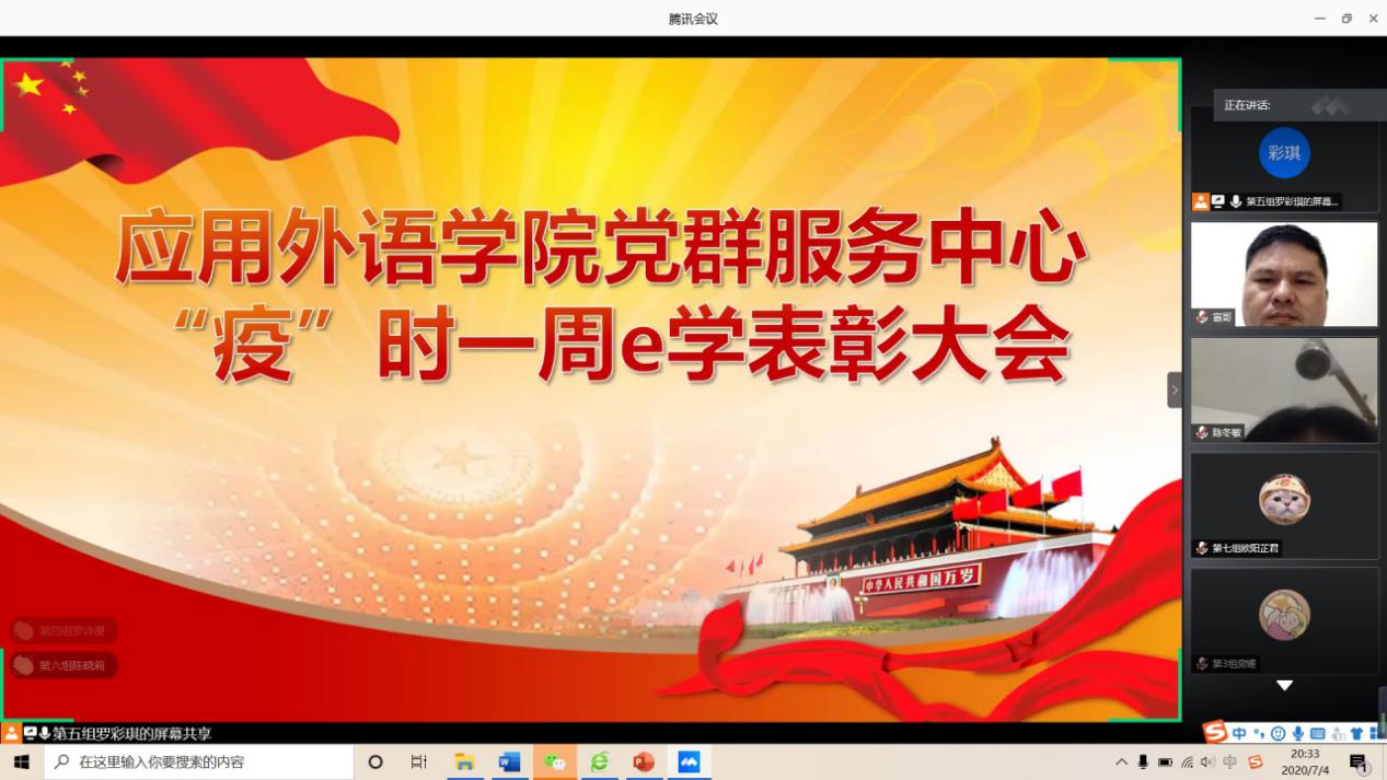 7月4日晚,应用外语学院“党群服务中心‘疫’时一周e学表彰大会”线上举行,应用外语学院党总支书记李德富、党总支副书记罗春科、指导老师冯锐骐、获奖代表、党积极分子等一同参加本次大会。