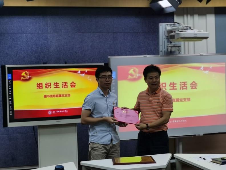 组织生活会的第四项,由陈珊兴副校长、支部副书记汪宇波分别为受学校表彰的抗击疫情先进基层党组织:图书信息直属党支部;优秀党支部书记:王斌;教工优秀共产党员:周平、曾南昌;抗击疫情优秀共产党员:卢志海、梁毓玲、詹东霖进行颁奖,大家用热烈的掌声表示祝贺。