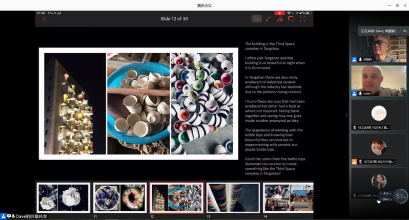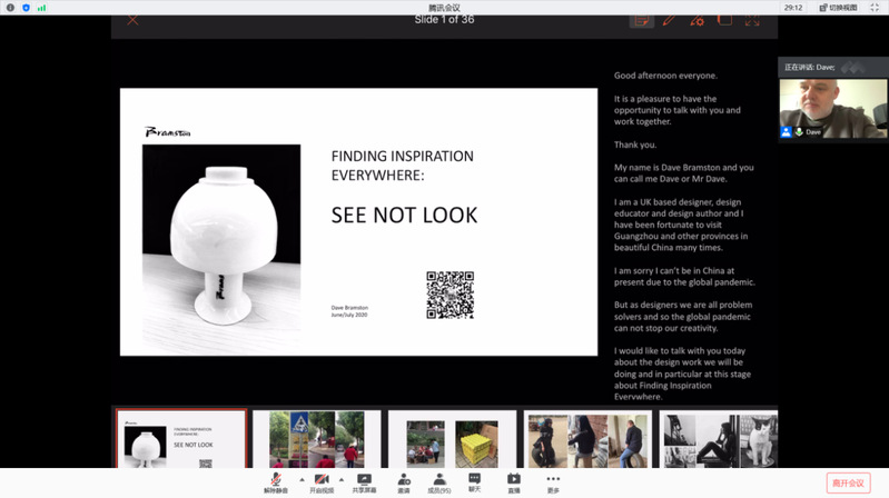 工作坊于6月29日举行了网络开课仪式,徐勇军院长致欢迎辞并对前3届工作坊做了回顾(图1),对同学们的学习提出了相关要求。接着David Bramston教授和邱登科教授做了“设计灵感的来源”为主题的开课讲座(图2-图4)。David Bramston教授将自身的经验授予同学们,如何正确理解Upcycling、认识材料、感知材料,用幽默的语言、渊博的知识、生动的讲解激发了同学们对设计的重新认识以及更加深层次的热爱。