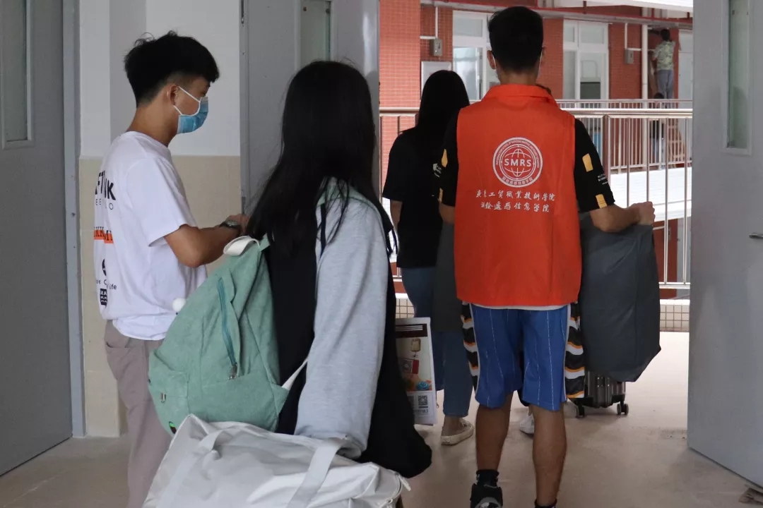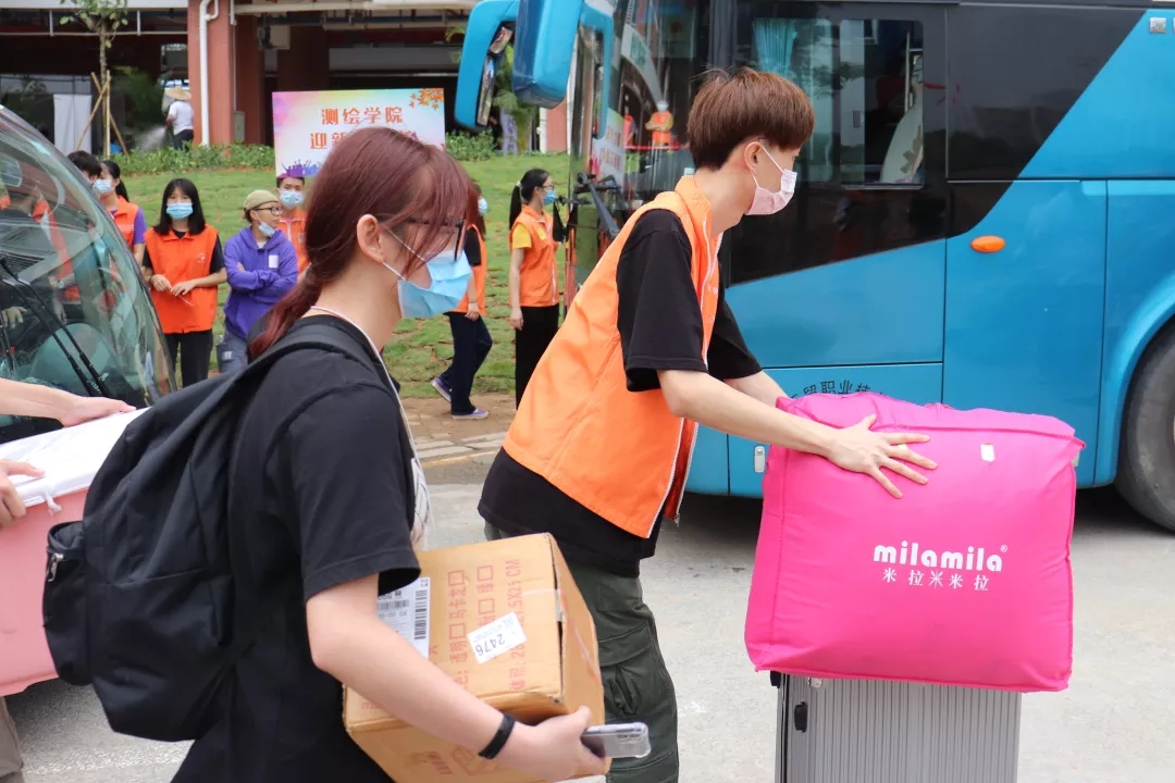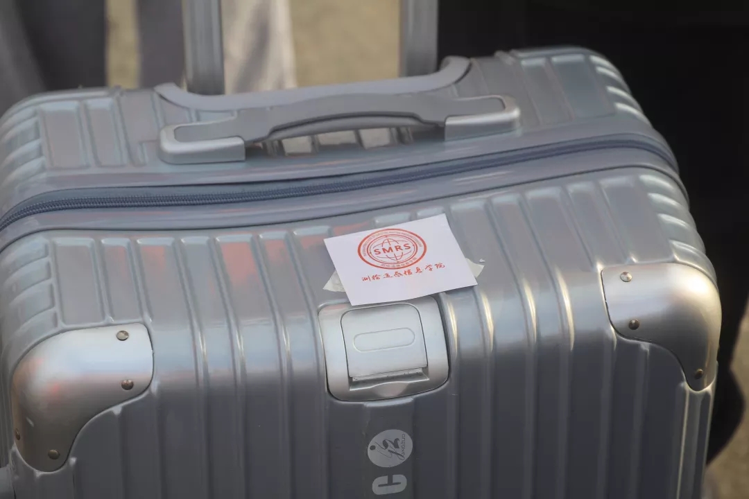 同时为避免同学们在校园巴士运输过程中丢失行李,还在每个行李上粘贴了学院院徽贴纸。