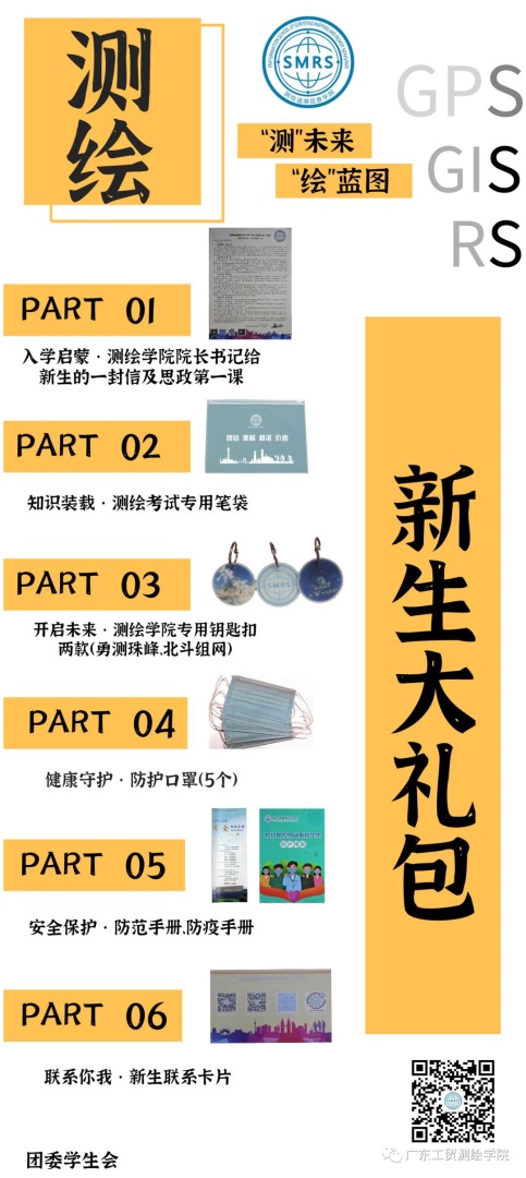 今年测绘学院给每位新生精心设计和制作大礼包一份,内含;1、入学启蒙.测绘学院院长书记给新生的一封信及思政第一课;2、知识装载.测绘考试专用笔袋3、开启未来.测绘学院专用钥匙扣4、健康守护.防护口罩、5、安全保护.防范手册,防疫手册6、联系你我.新生联系卡片。