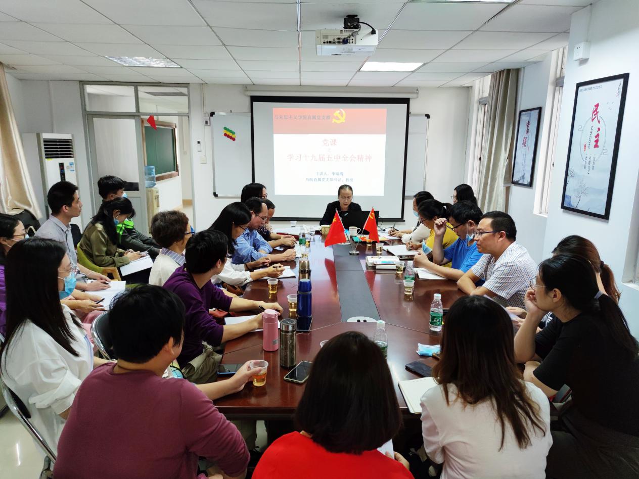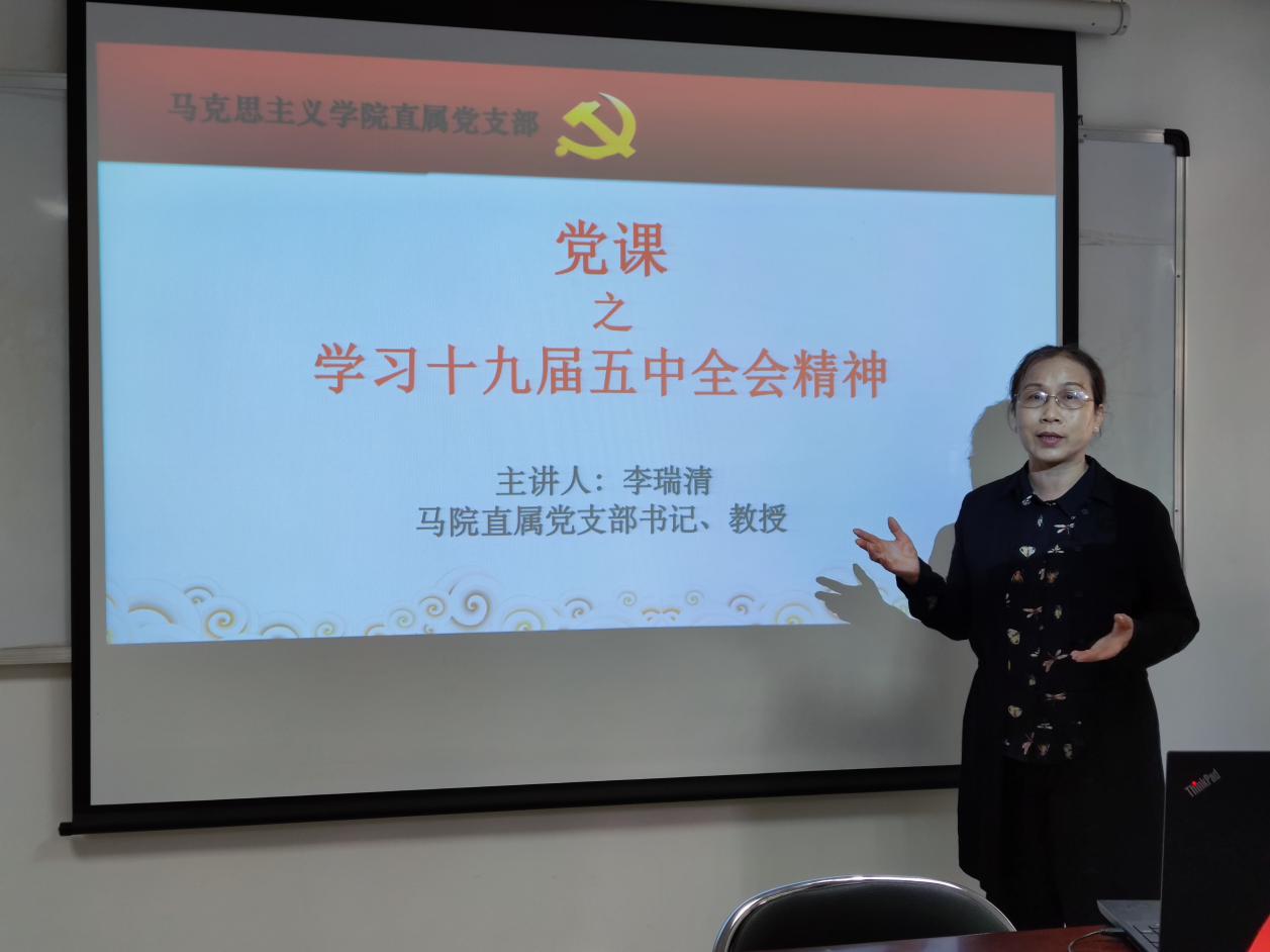 为贯彻落实“三会一课”制度和学校关于《党员组织生活、教职工政治学习及工会安排(2020年秋季学期)的通知》要求,及时传达学习党的十九届五中全会精神,11月3日下午,马克思主义学院直属党支部组织开展了一场“学习党的十九届五中全会精神”专题党课学习,主讲人是马院直属党支部书记、常务副院长李瑞清,全体教职工党员参加了学习。