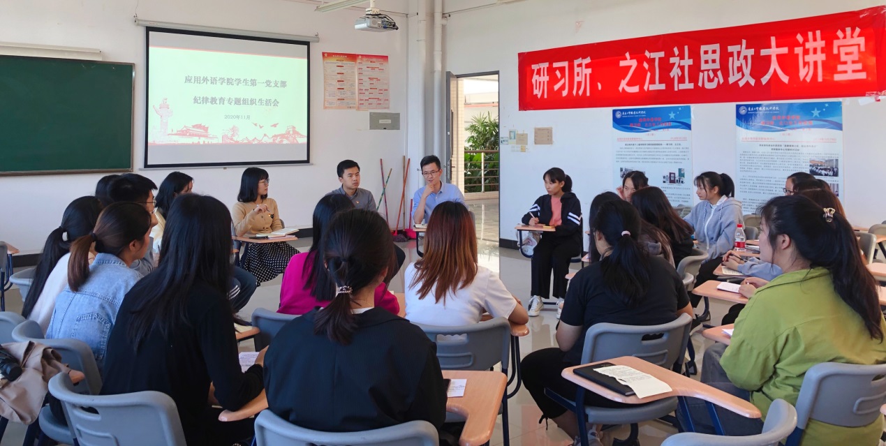 根据《中共广东工贸职业技术学院2020年纪律教育学习活动实施方案》的部署要求,应用外语学院学生第一党支部于11月24日下午在教学楼1-618党员活动室开展了以“严守政治纪律,践行‘两个维护’”为主题的纪律教育专题组织生活会。支部书记陈晓玲老师、宣传委员兼组织委员、学院学工办主任林耀佳老师、纪检委员李迪老师,以及支部全体在校学生党员参加了本次会议,会议由支部书记陈晓玲主持。