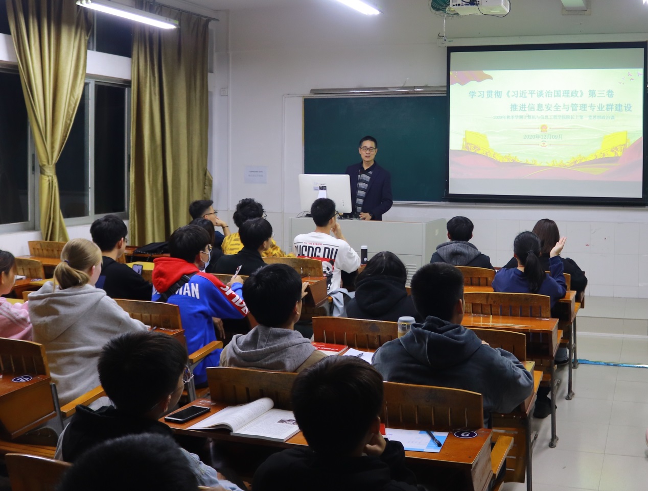 根据学校《关于做好2020年秋季学期二级学院党总支书记、院长上第一堂思政课工作的通知》的文件精神,12月9日晚,计算机学院院长“思政第一课”活动在天河校区教学楼202举行。院长余棉水围绕学习《习近平谈治国理政》第三卷的内容,结合学院推进信息安全与管理专业群建设,为19、20级信息安全与管理专业学生代表上了一堂思想深刻、内容丰富的思政课。