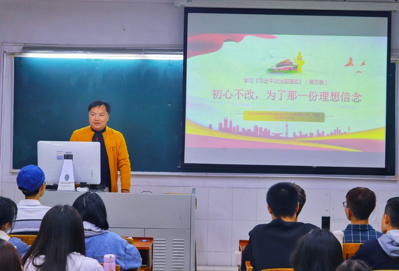 根据学校党委安排,12月9日晚,计算机学院党总支书记上第一堂思政课活动在天河校区教学楼203举行。党总支书记张宁围绕学习《习近平谈治国理政》第三卷的内容,以《初心不改,为了那一份理想信念》为题,为2020级新生代表上了一堂生动的思政课。