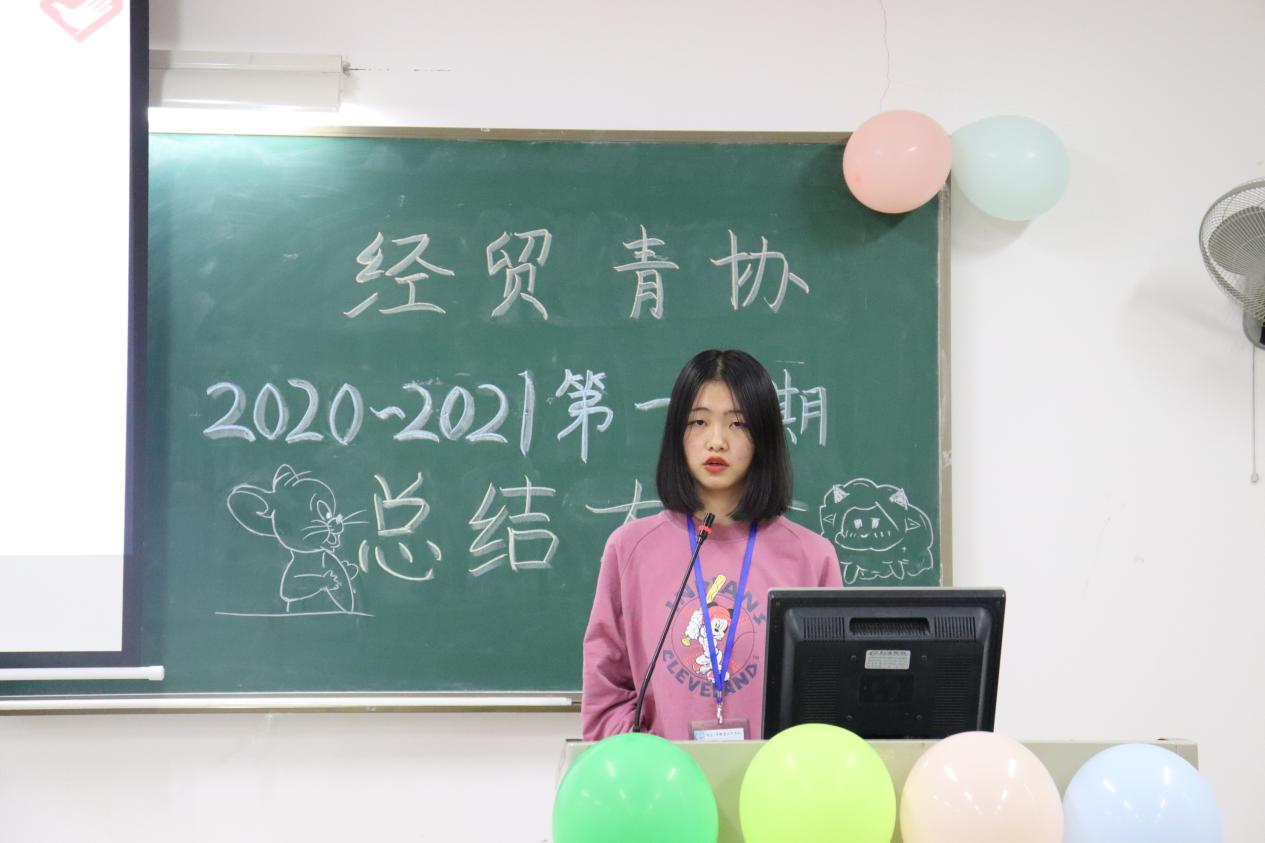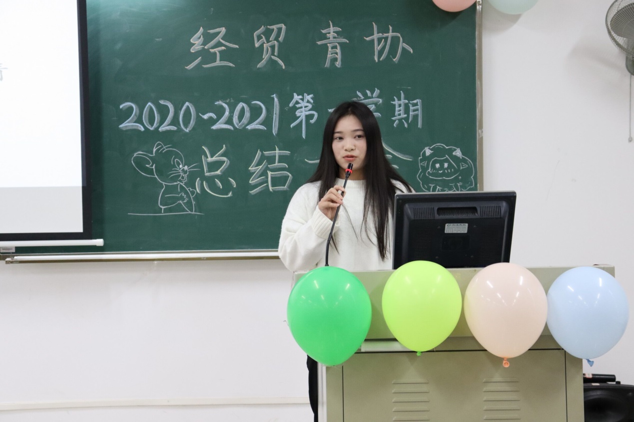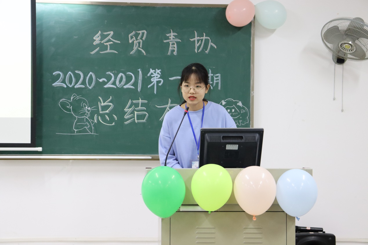 大会上,秘书长利海娥简明扼要总结了经贸青协这一学期的各项工作,本学期举行了有光盘行动、互联网+国际贸易综合技能大赛志愿活动、迎接新生志愿活动、拜师礼志愿活动等。同时希望20级新干事每一天都要进步,善于发现自身的优点并充分发挥自身优势,为学校和社会做更多奉献。