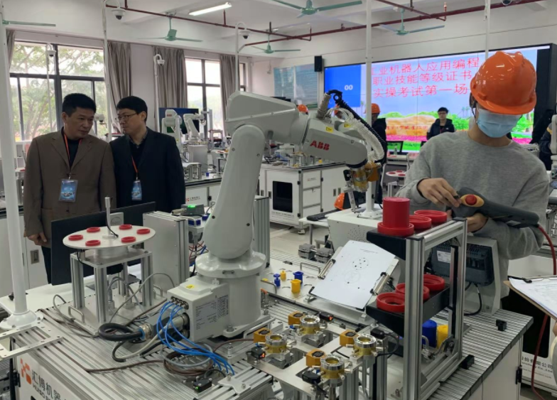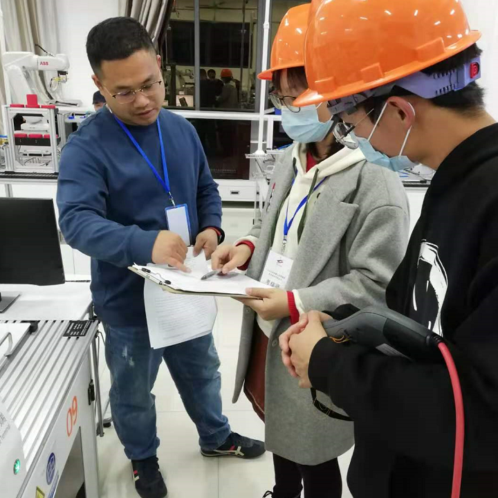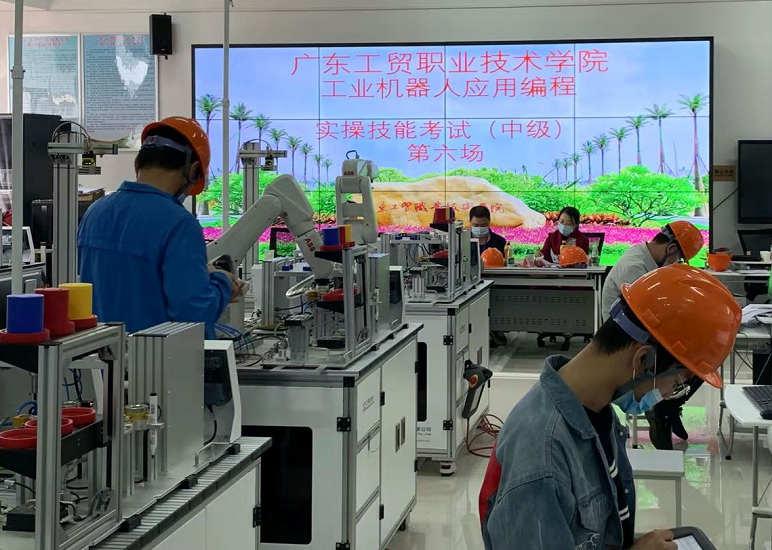 广东工贸职业技术学院作为广东省首家“1+X工业机器人应用编程职业技能等级证书”考核管理中心,担任着省内多所院校的考核任务。在时间紧,任务重,设备有限的情况下,机电学院领导班子高度重视并制定出有效的考核管理工作方案,由机电学院电气控制系刘益标主任为核心的教学队伍协同现代制造技术中心共同组建1+X团队,经过两个月的努力奋斗,组织了此次1+X证书的考证工作。本次培训和考核共计142名学生参加,其中我校91人,广州城市职业学院31人、汕头职业技术学院20人。