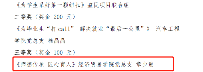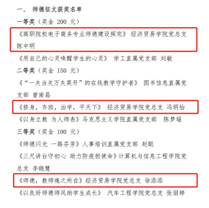 转眼间,2020年已经接近尾声,经贸学院的好消息可向来不会停下脚步。近日,根据《关于表彰2020年师德建设主题教育月优秀征文和优秀微视频的决定(粤工贸院党宣〔2020〕14号》精神,在学校开展师德建设主题教育月活动中,陈中明、冯玥怡、徐添添三位老师分别获得“淬炼师德师能,践行育人使命”主题征文的一、二、三等奖,章少重老师获得主题微视频三等奖。值得一提的是,因为组织有力,学院成为参赛作品最多,获奖数量最多的单位,学院也因此荣获优秀组织奖。