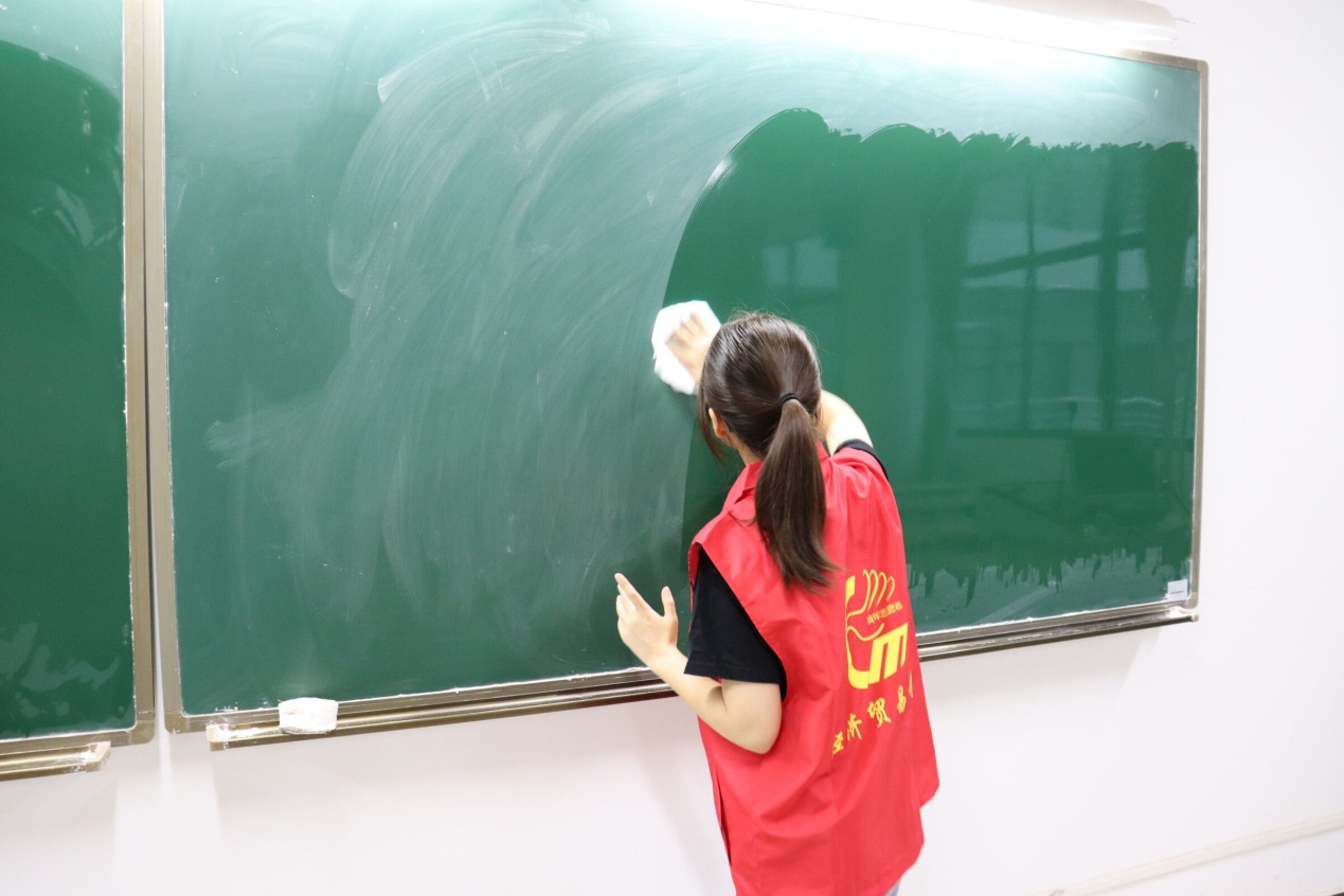 活动中,各小组积极有效的分配工作。各负其责,相互配合。清扫地板,擦拭黑板,整理窗帘,并把桌椅摆放整齐。清扫工作进行的井然有序,志愿者的汗水与整洁的课室珠联璧合。课室焕然一新,更添了一份学习的氛围。