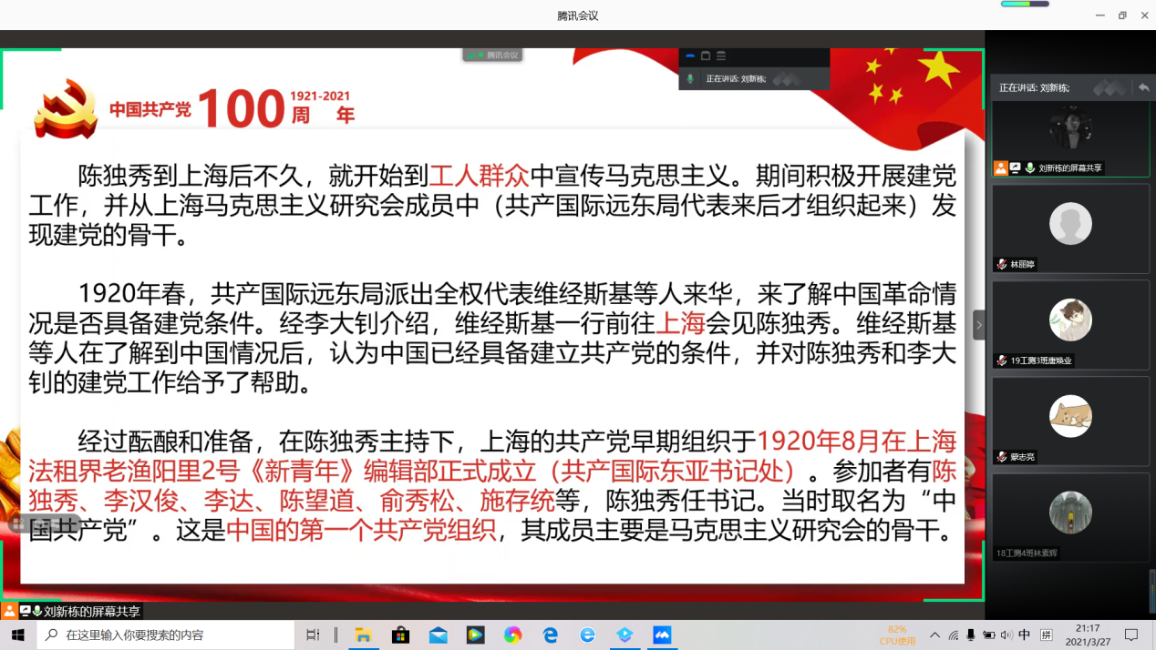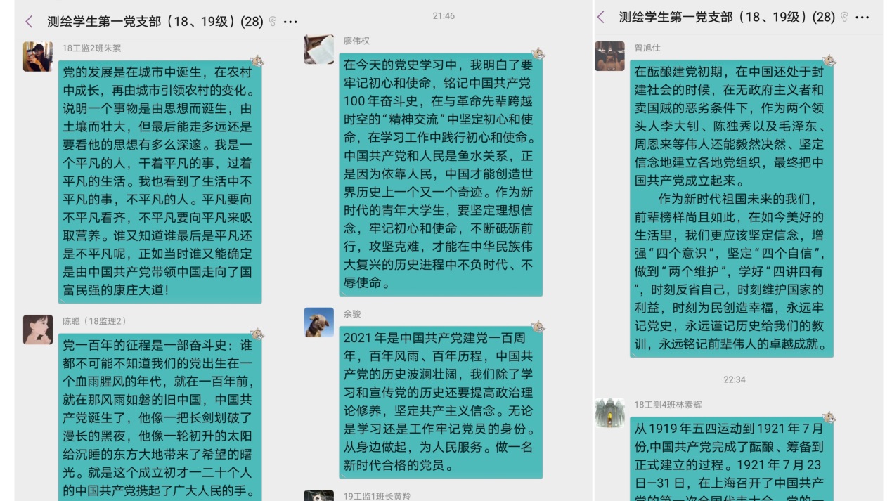 为庆祝中国共产党成立100周年,结合支部学生党员基本分散在各地实习的实际情况,测绘遥感信息学院学生第一党支部通过腾讯会议和微信“移动微课堂”召开线上党史学习教育。3月28日晚,支部开展了第二次党史学习,由学生第一党支部书记张玉荷同志主持,支部全体学生党员参会。