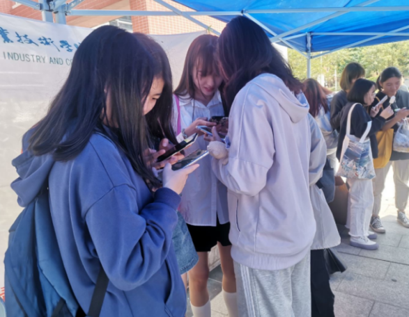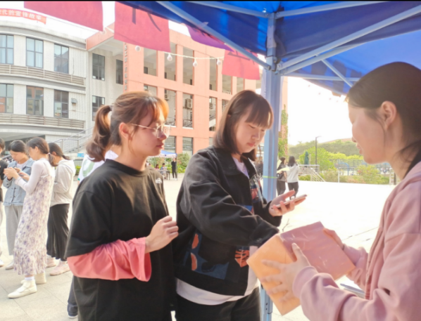 活动开始之前已有不少同学前来观望,工作人员便向同学们介绍了本次活动的主要内容:到摆摊处扫码进行线上问卷答题,一共20道题,答题成绩达到60分的参赛者可以进行抽奖,答题成绩达到80分的参赛者不仅可到摆摊处进行抽奖还可获得1学时。同学们兴致勃勃的听着工作人员讲解。