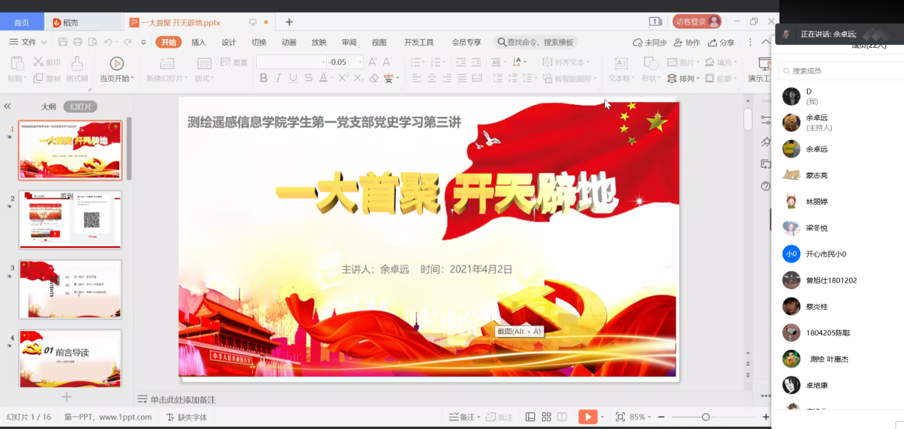 为庆祝中国共产党成立100周年,结合支部学生党员基本分散在各地实习的实际情况,测绘遥感信息学院学生第一党支部通过腾讯会议和微信“移动微课堂”召开线上党史学习教育。4月2日晚,支部开展了第三次党史学习,由学生第一党支部书记张玉荷同志主持,支部全体学生党员参会。