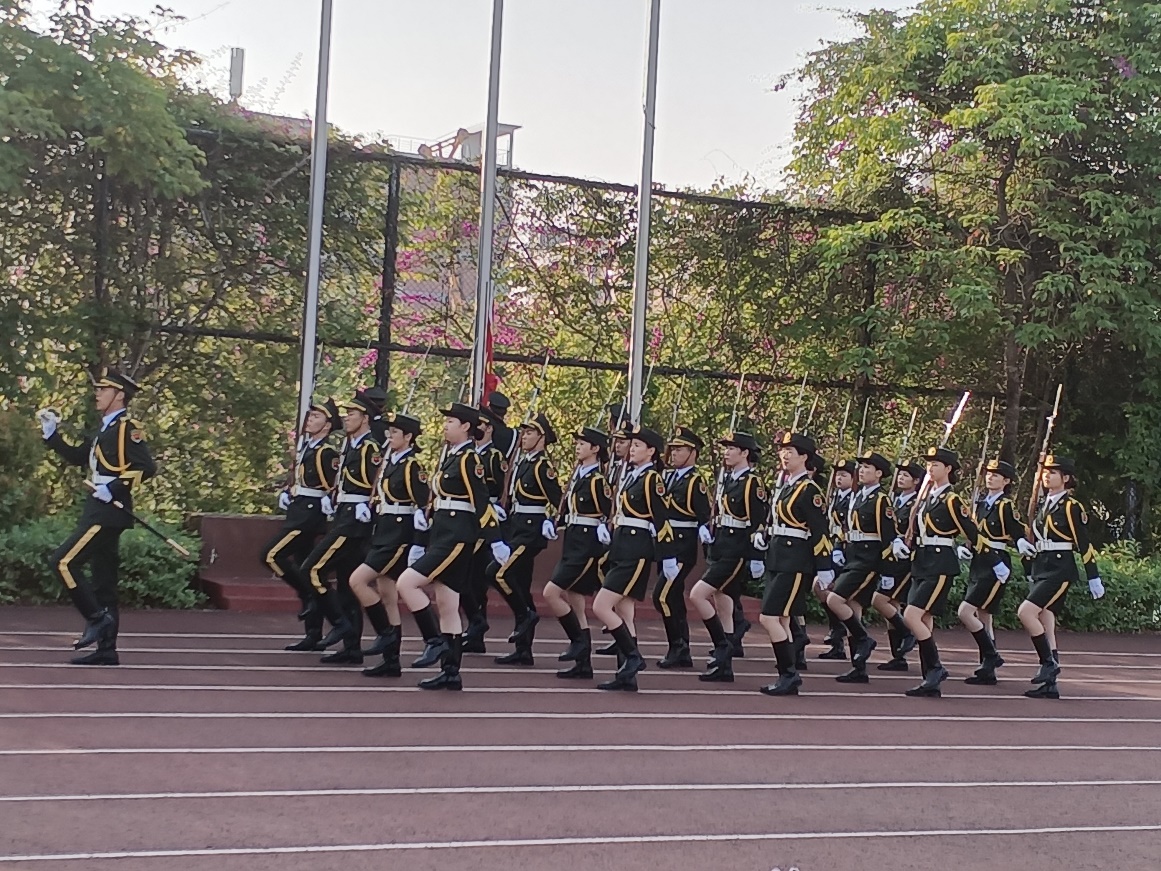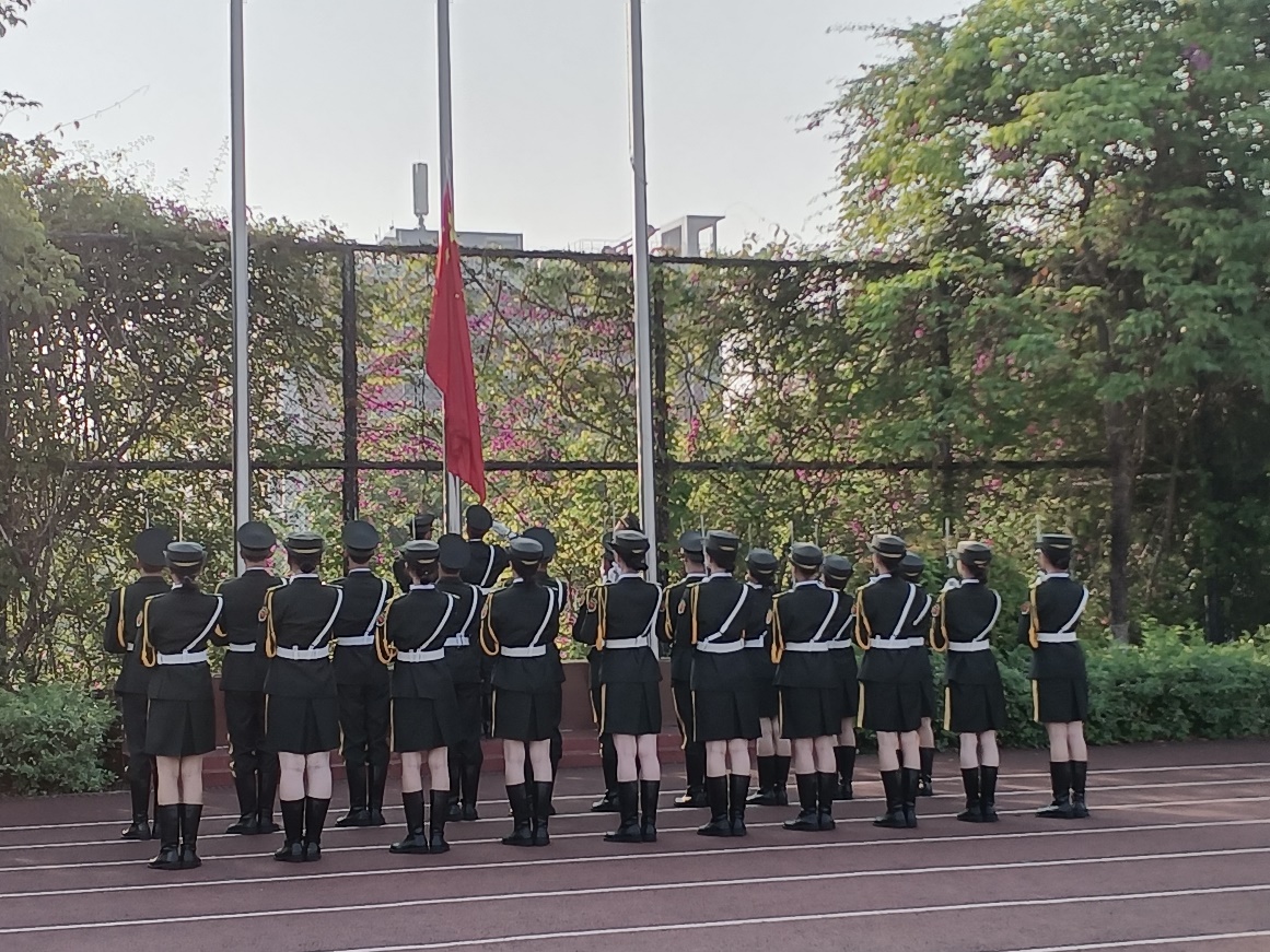 升旗仪式于早上7:45准时开始。迎着朝阳,国旗护卫队的升旗手护旗手们护卫着鲜艳的五星红旗入场,着装整齐、步伐矫健。随后,伴随着庄严的《义勇军进行曲》的响起,全体行注目礼,庄严肃穆,嘹亮的国歌声响彻整个校园。冉冉升起的五星红旗激发了同学们不断向上的斗志,点燃了同学们强烈的爱国热情。