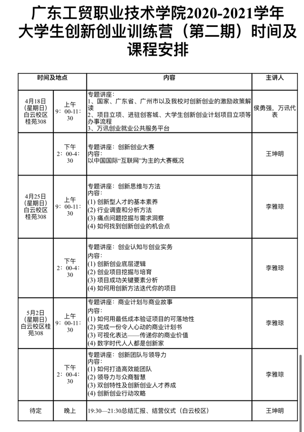 为遵从习近平总书记对职业教育工作的重要指示,推动职普融通,增强职业教育适应性,聚焦校园中“双创干部”这一群体,为我校双创教育夯基固本,提升学生干部队伍在创新创业方面的引导能力。4月18日,由双创学院举办的2020-2021学年大学生创新创业训练营(第二期)第一课于白云校区桂苑三楼308正式开课。20级三年制各班双创委员93人参与此次课堂。