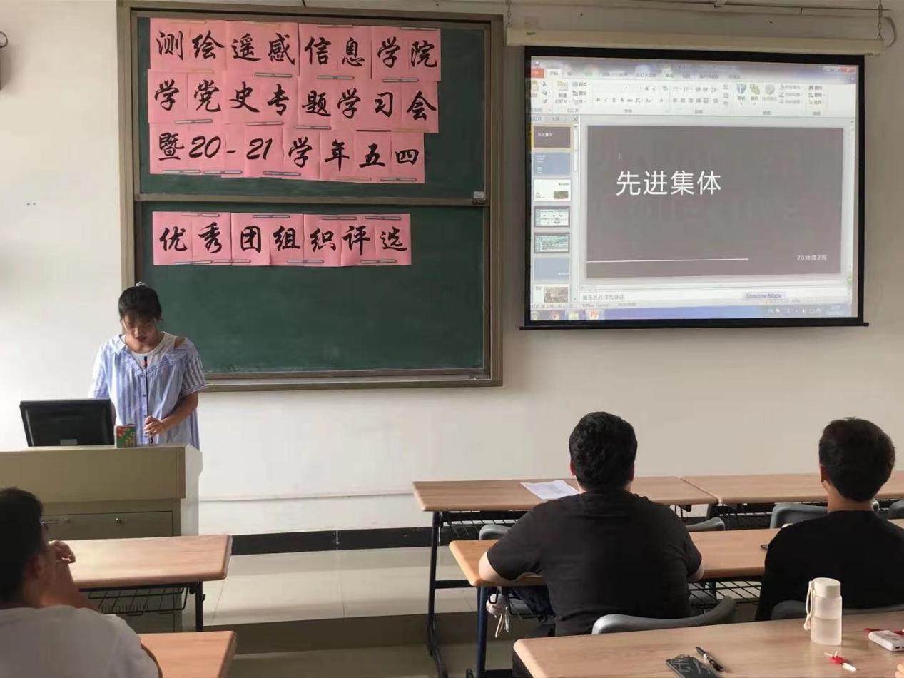 活动开始,首先由测绘遥感信息学院团委书记陈君浩老师围绕“学党史、强信念、跟党走”为主题召开了本次学党史专题学习会。介绍了从五四运动到中国共产党成立,这段“觉醒年代”的党史历程。各班团支书,分享了学习体会。随后,开展20-21学年“五四”优秀团组织评选,由各支部团支书上台演示介绍本团支部概况,包括“三会两制一课”、青年大学习、团务建设、工作成效、获得荣誉、主题团日、党章学习等。