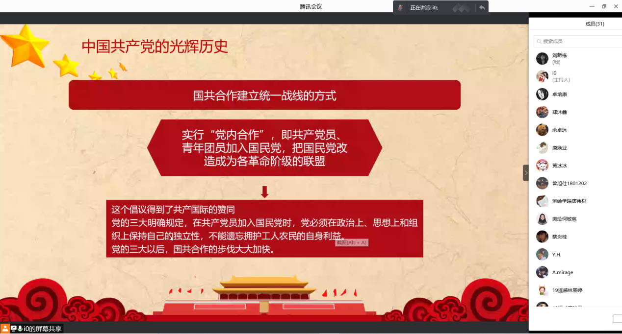 本次学习由预备党员叶惠杰主讲,主题为《国共合作 共创大业》,通过观看视频及PPT讲解相结合的形式,讲述了大革命时期,中国共产党与中国国民党首次建立合作的历史故事。以国共两党合作为特征的革命统一战线的建立,加速了中国革命的进程,在中国革命历史上出现了轰轰烈烈的大革命。