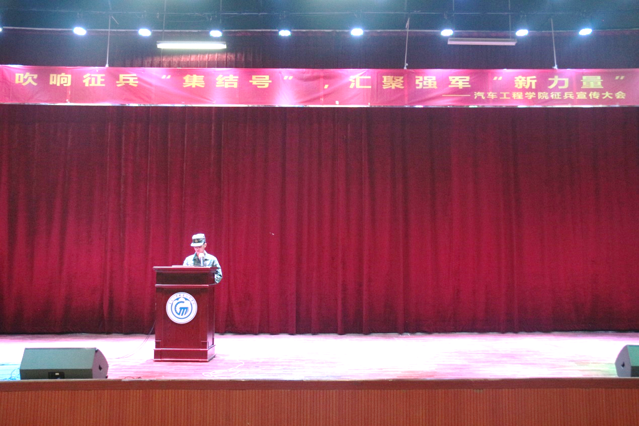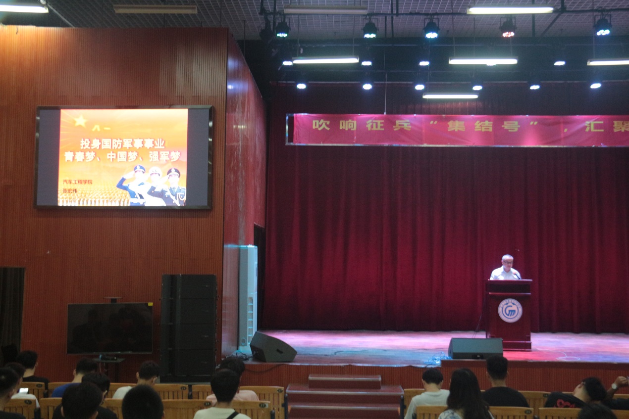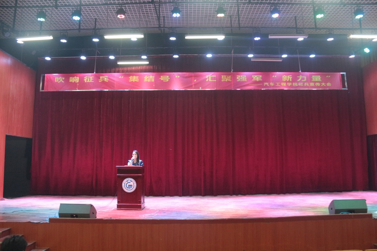 为切实做好2021届毕业生的就业和征兵工作,汽车工程学院于5月13日在明德楼演艺厅举行2021届毕业生大会暨“吹响征兵集结号,汇聚强军新力量”主题征兵宣传会。副校长唐毓秋、院长王艳芬、副院长潘梦鹞、党总支副书记欧敏出席,学院辅导员及全体毕业生参加了本次大会。会议由党总支副书记欧敏主持。