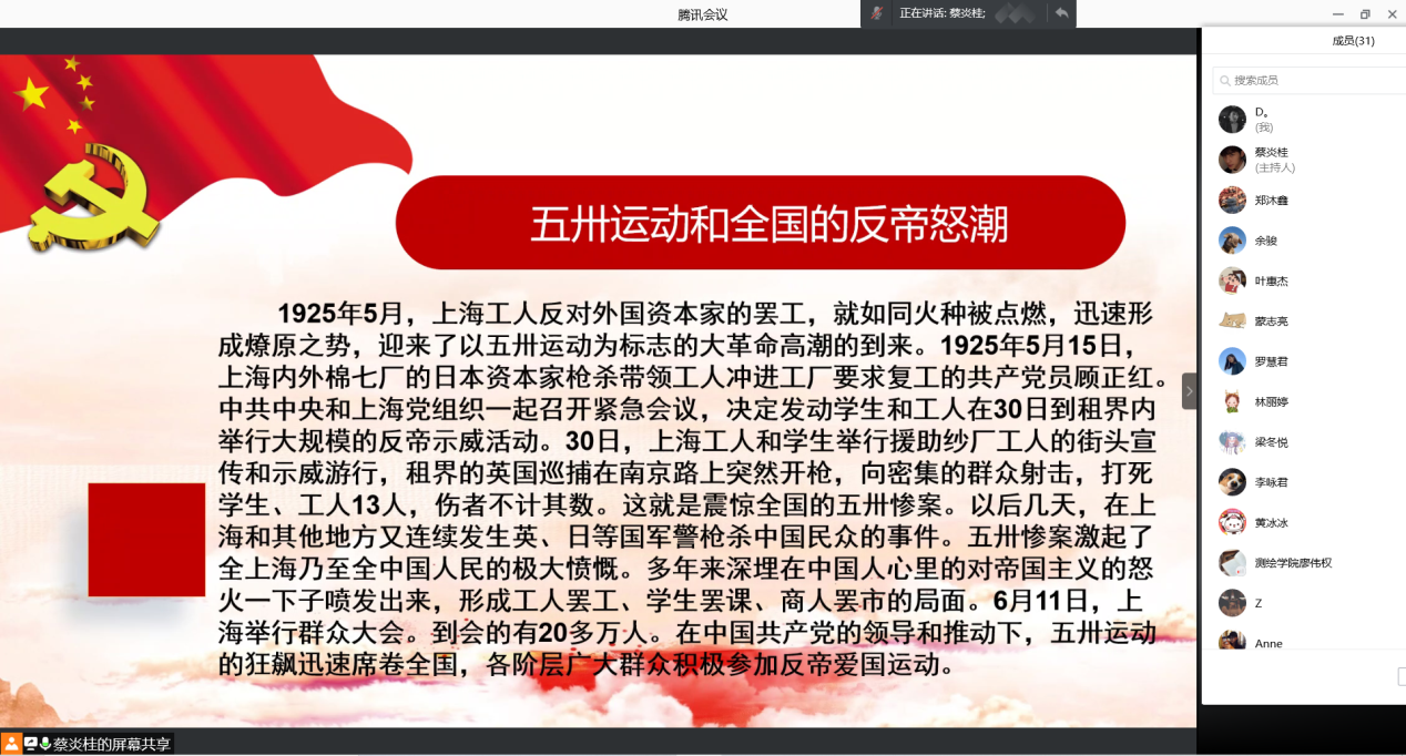 本次学习由正式党员蔡炎桂主讲,主题为《五卅运动和革命高潮的兴起》,观看历史记录片,并以讲解PPT形式开展学习。