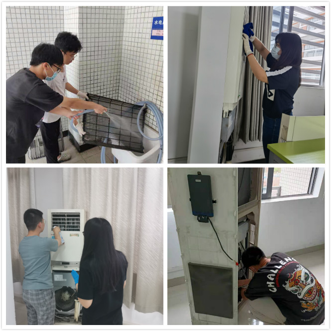 广州的夏天,酷热是众所周知的;六月的校园,教学场所闷热是同学们常吐槽的;机房的旧空调,其清洁、消毒及制冷效果是大家关注的;五月下旬开始,广州局部的疫情,是广大师生都忧心的。针对以上问题,科研实训直属党支部经充分调研,把实训室空调的清洁、消毒工作列入“我为群众办实事”清单,并按“以学促行,以行践学”的党史学习路径,组织党员、老师及学生开展“学党史不忘初心,办实事追梦前行”为主题的实践志愿活动,真心实意为师生办实事、解难题。