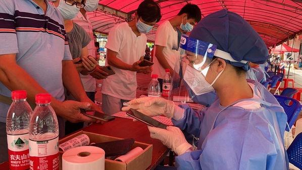 学生党员黄依烔在洞庭社区核酸检测点进行信息录入等工作