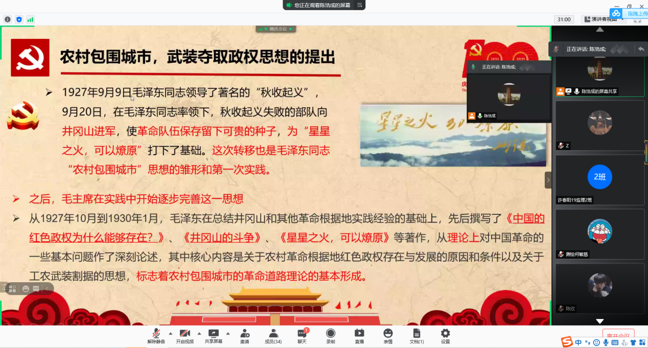 为扎实开展好党史学习教育,提高学生党员参加党史学习教育的积极性与主动性,测绘遥感信息学院学生第一党支部自3月份以来持续开展“党员讲党史”系列活动。5月18日下午,支部在白云校区第一会议室召开了“讲党史、筑初心”党史学习教育专题活动,在活动中开展了“党员讲党史”系列活动的第十讲。此外,结合支部学生党员基本分散在各地实习的实际情况,18日晚支部在校外参与实习的党员利用腾讯会议和微信“移动微课堂”等平台开展了线上学习。