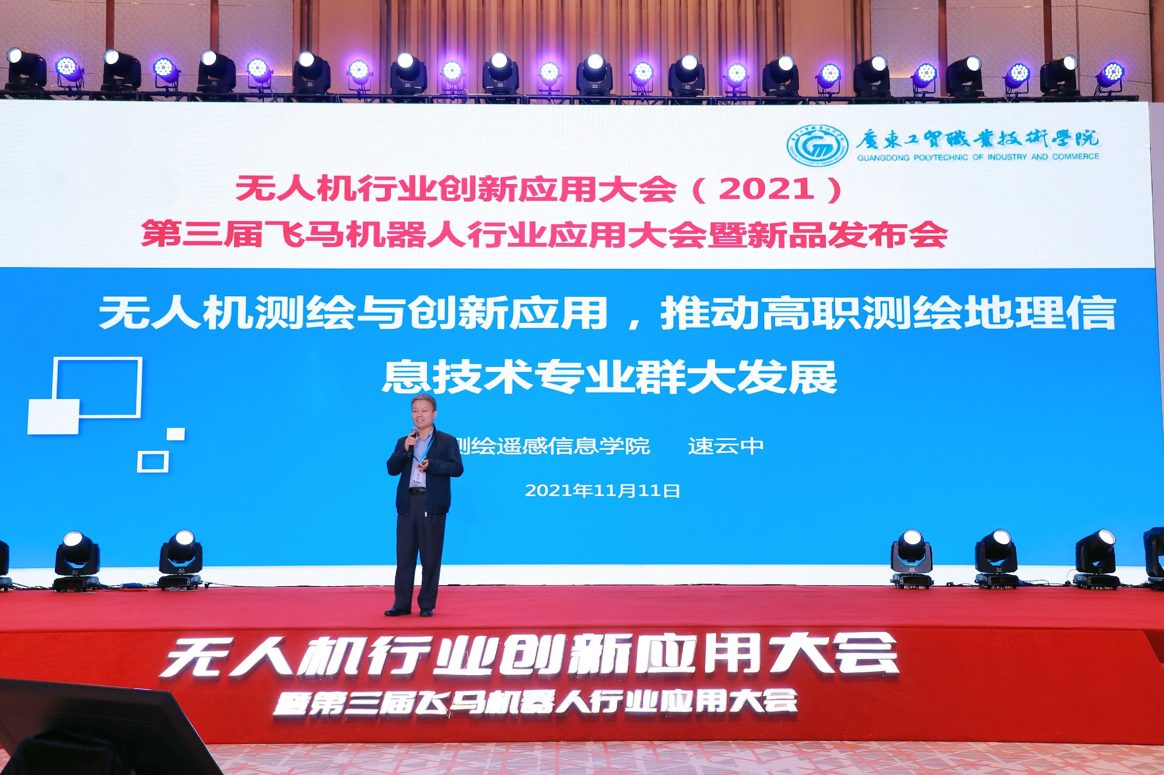 11月11日2021无人机行业创新应用大会暨第三届飞马机器人行业应用大会于广州黄埔国际会议中心召开。本次会议由中山大学、深圳飞马机器人科技有限公司联合主办,得到了业界的广泛关注与大力响应。中国科学院院士、原科技部部长徐冠华于会上做了线上演讲,中国科学院院士、中国工程院院士李德仁、深圳飞马科技有限公司董事长兼CEO陈文晖、深圳飞马科技有限公司副总裁张世杰等莅临会议现场。测绘遥感信息学院党总支书记、院长速云中受邀参加,并做了以“无人机测绘与创新应用,推动高职测绘地理信息技术专业群大发展”为主题的报告。