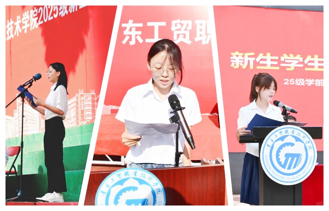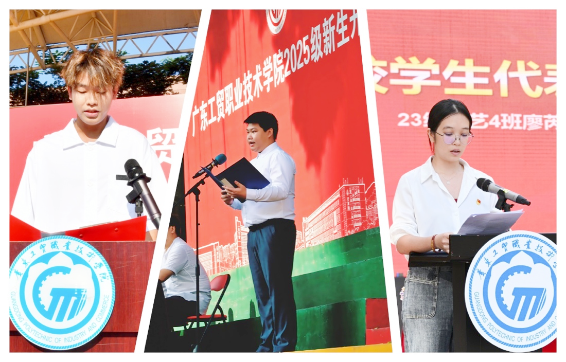 新生代表2025级商务英语专业学生林桐欣(白云校区)、数字媒体技术专业学生许冰(天河校区)、学前教育专业学生周贝蓓(荔湾校区)分别上台发言。他们表达了对大学生活的无限期待和刻苦学习的坚定决心,表示将牢牢把握机会——既要脚踏实地学好每一门课,也要抬头望向远方,找准自己的人生方向,带着“闯”的勇气、“创”的脑洞、“干”的硬核,在工贸书写“爆款答卷”,为民族复兴铺路搭桥,为祖国建设添砖加瓦,为党和国家事业发展贡献青春力量,展现青春担当。