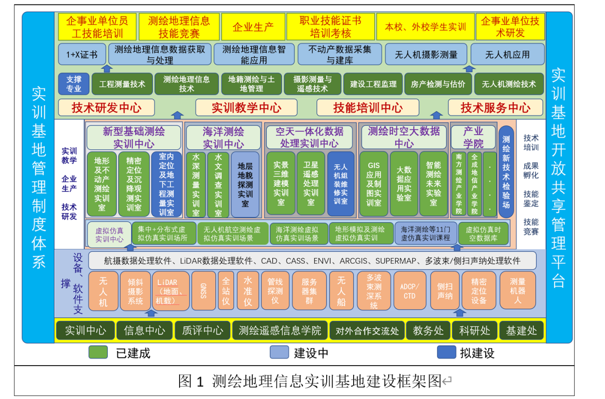 以“空天地海”数据融合为理念,建成能够满足教学、科研、培训、技术服务及技能竞赛“五位一体”的测绘地理信息实训基地,推动教育链、产业链、专业链、人才链有机衔接。①以“把地球带回家”为思路,与南方测绘、至远海洋等高端企业围绕天地一体化测绘、空间信息智能处理、实景三维等场景建立产业高端实训室,形成“一院一场五中心”。②以“解决三高三难”为抓手,依托“数字化全景虚拟仿真时空数据库”与“虚拟仿真实训教学共享管理平台”,按照“一库、一平台、两场景、N仿真”的框架,通过与多家龙头企业合作,建成国家测绘地理信息技术虚拟仿真实训基地。③以“协同共建共享”为宗旨,与南方数码、商汤科技等龙头企业共建测绘地理信息开放型区域产教融合实践中心,培育产教融合型企业、双工作室、校外实训基地等协同技术技能创新平台,形成仪器设备资源共享、共同承接生产项目与技术技能攻关的长效合作机制,强化协同育人机制。