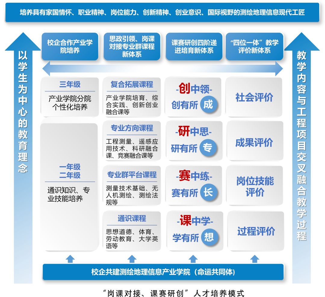 测绘地理信息产业变革升级,亟须培养跨专业融合并具备多岗位适应能力的复合型高端技术技能人才。专业群以校企共建产业学院为载体,探索了一、二年级专业群内打通培养、三年级分方向个性化培养的人才成长新路径,提出了测绘地理信息技术专业群“岗课对接、课赛研创”人才培养模式新理念。构建了①“思政引领、岗课对接、能力为重,赛研创嵌入”的专业群课程体系,将思政元素、新技术新标准、赛研创项目融入课程标准和教学过程,实现学生德技并修;②“课赛研创”四层递进式人才培育体系,引导学生“课中学-赛中练-研中思-创中领”,实现赛教融合、研创并举,培养学生自主探究和解决岗位复杂问题能力;③“四位一体”人才评价体系,设计了与学生学习规律及成长的阶段性规律相适应的学习效果评价体系,发挥教学评价的激励、反馈调控功能,促进人才培养质量持续提升。