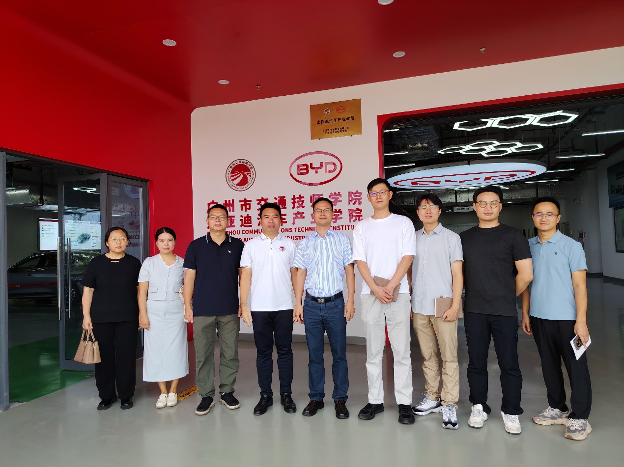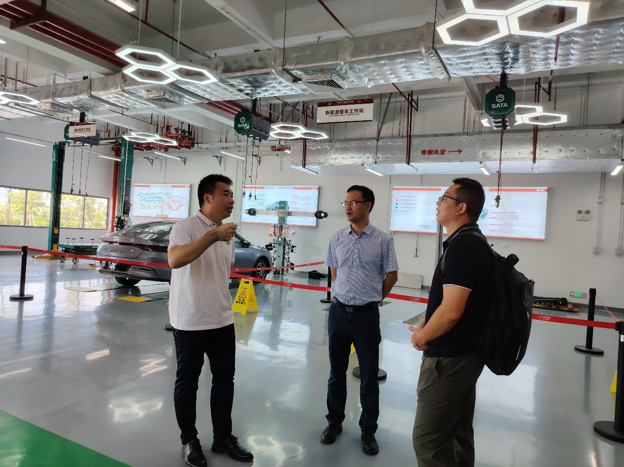 汽车与能源产业系的新能源汽车检测与维修专业,为人社部工学一体化建设专业、工信部首批产教融合试点专业及广州市重点建设专业,专业技术实力雄厚。在陈守青主任陪同下,调研团队实地参观了比亚迪产业学院、特斯拉产业学院、广汽产业学院,详细考察了动力电池装配与测试、高压维修、新能源整车维护保养等系列实训基地,深入学习新能源实训基地建设经验。