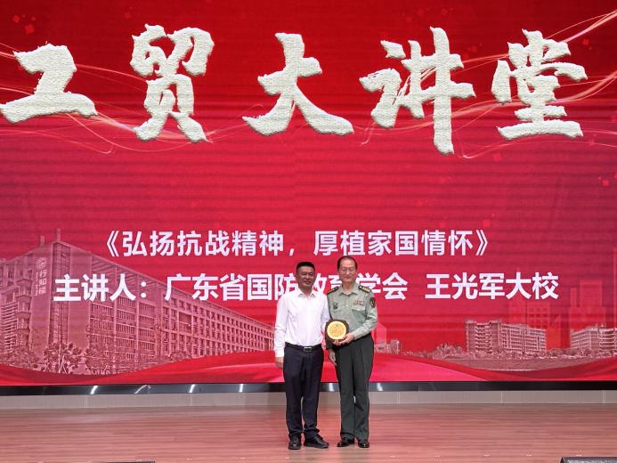 本期“工贸大讲堂”特邀广东省国防教育学会副会长兼秘书长王光军大校作《弘扬抗战精神,厚植家国情怀》专题讲座。王光军大校围绕抗战精神的历史渊源、时代价值与实践传承三个层面,结合丰富史料与生动案例,系统阐释了抗战精神的深刻内涵。他指出,抗战精神是中华民族宝贵的精神财富,是激励我们砥砺前行、奋发有为的强大动力,呼吁青年学子挺膺担当,将“小我”融入“大我”,把热血青春挥洒在强国强军的伟大征程上。现场师生深受感染,从先辈事迹中深刻体悟到“强国必须强军,军强才能国安”的厚重内涵,将使命担当内化于心。讲座结束后,学校党委委员、副校长唐毓秋代表学校向王光军副会长赠送“工贸大讲堂”纪念牌。
