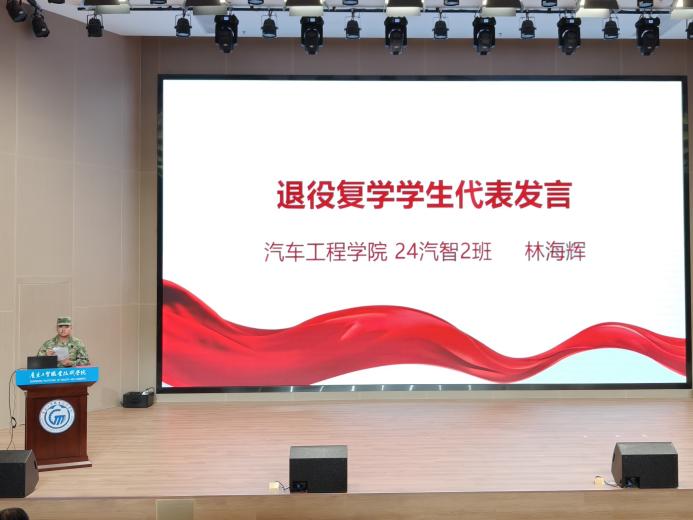 汽车工程学院24汽智2班林海辉同学作为退役复学学生代表在会上发言。他结合自身五年军旅生涯,深情讲述了军营如何锤炼意志、塑造品格、培养担当的成长历程,展现出新时代大学生士兵的奋进风采。他以自身蜕变诠释“榜样力量”,号召广大同学胸怀家国、勇于追梦,积极投身强军实践,在军营这片热土上书写别样精彩的青春篇章。