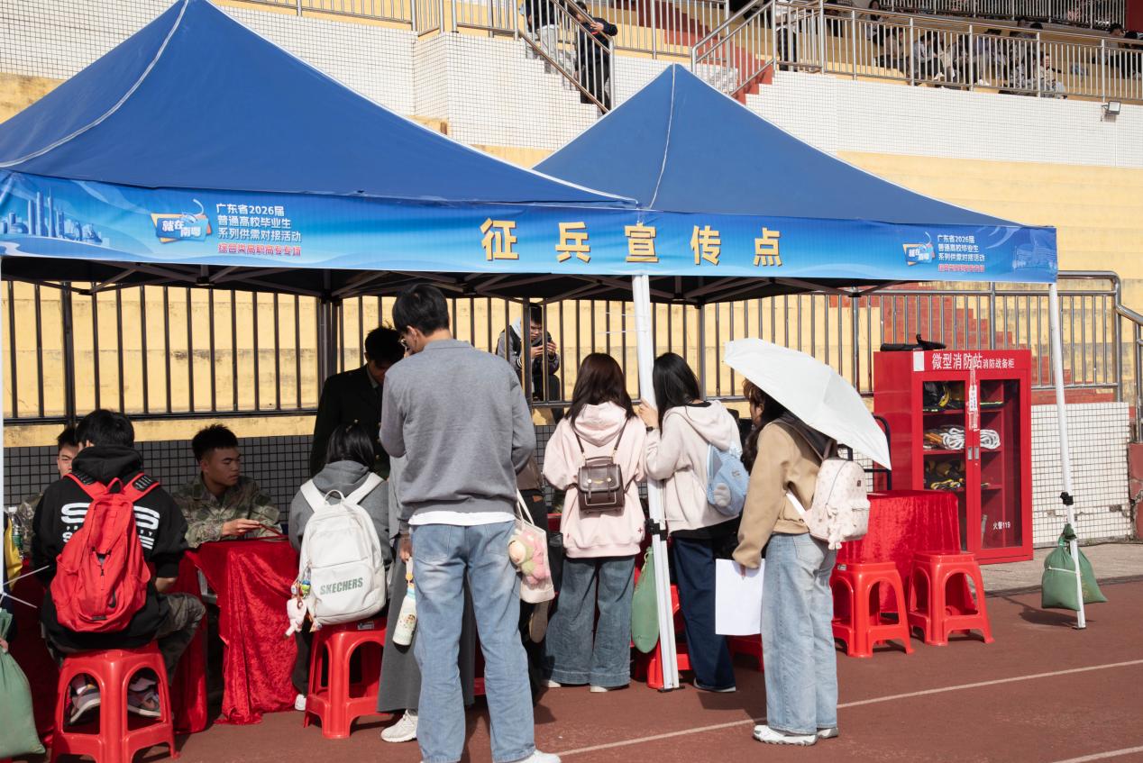 值得一提的是,活动现场精心设置了多个特色功能专区,为毕业生提供全方位服务。其中,教育教学成果展示区集中呈现了我校育人成果,帮助企业更直观地了解毕业生的专业素养;国防教育及征兵宣传咨询服务站则为有志于投身国防事业的毕业生提供政策解读与咨询指导。活动充分发挥广东省职业生涯咨询特色工作室的优势,打造了生涯规划与就业指导一站式服务平台。现场设置的“职己”加油站、“职己”天降offer、“职己”打气筒、“职”播为你等特色区域,通过政策宣讲、简历优化、面试技巧指导、实时岗位推荐等多样化服务,为毕业生缓解求职焦虑、提升求职能力提供了有力支撑,赢得了毕业生与参会企业的一致好评。