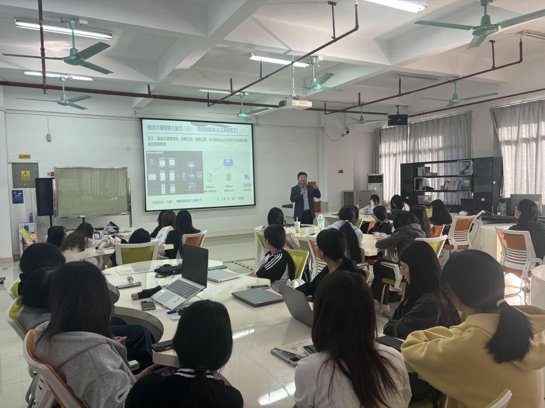授牌仪式后,郭科研以“人工智能赋能智慧物流发展与职业机遇”为题开展专题讲座。解析了人工智能在物流路径优化、智能分拣、库存精准预测等领域的应用成果,并从智慧物流行业未来人才需求出发,向学员提出了“专业能力+AI技术”的复合型发展建议,赢得现场师生阵阵掌声。