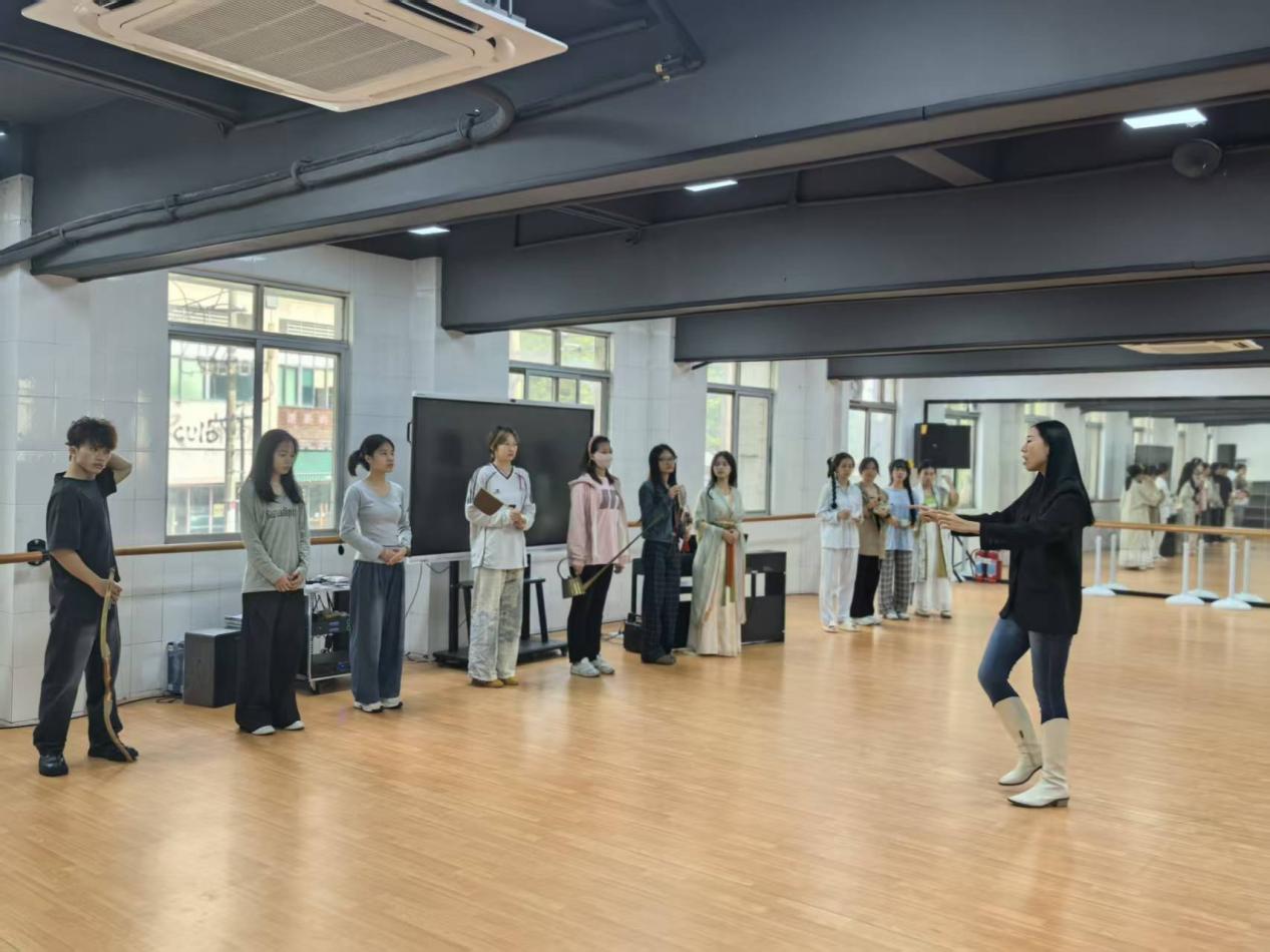 从设计到展演,《茗途汉韵》全程是一堂学习贯彻党的二十届四中全会精神的产教融合实践课。学院以芳村茶叶产业需求为导向,将“茶文化传承”与“文创设计创新”纳入专业核心实训课程;通过组织学生深入芳村茶企、茶文化博物馆,访谈茶人、梳理茶史,积累创作素材;同时,师生团队联合茶企设计师,将朝代服饰元素与茶品牌文化结合,完成16套原创茶服的设计与制作;在舞台排练、现场调度等方面,学生的艺术表现力与团队协作能力得到不断提升。这种“产业需求驱动教学、教学成果反哺产业”的模式,不仅将专业知识转化为服务区域经济的实际能力,更培养了学生的文化自信与社会责任感。