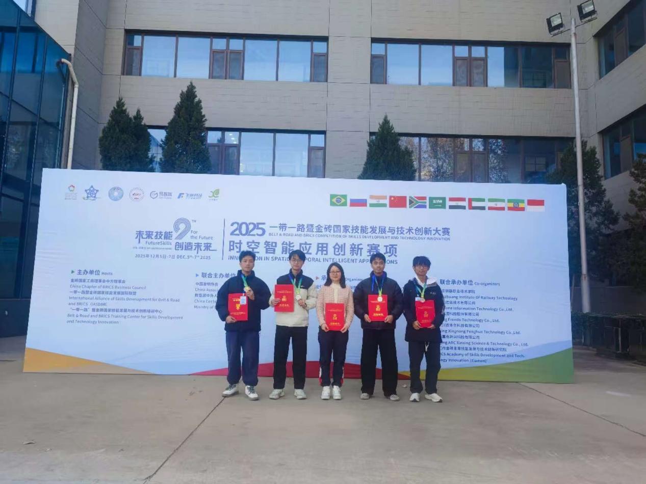 12月6日,2025年一带一路暨金砖国家技能发展与技术创新大赛之时空智能应用创新赛项国内赛决赛在石家庄铁路职业技术学院成功举办。本次大赛吸引了来自全国多所985、211重点本科院校及高职院校的师生同台竞技,竞争激烈。在学院领导和实训中心的大力支持下,测绘学院师生积极备赛、迎难而上。最终,在教师组的角逐中,常德娥荣获三等奖,吴萍昊荣获优秀奖。学生组方面,由张瑜、刘焕、朱志航、麦润殷同学组成的队伍(指导教师:常德娥、巢子豪)荣获高职组二等奖;由廖雪彤、莫志程、何俊熙、吴森城同学组成的队伍(指导教师:吴萍昊、邱献引)荣获高职组三等奖。