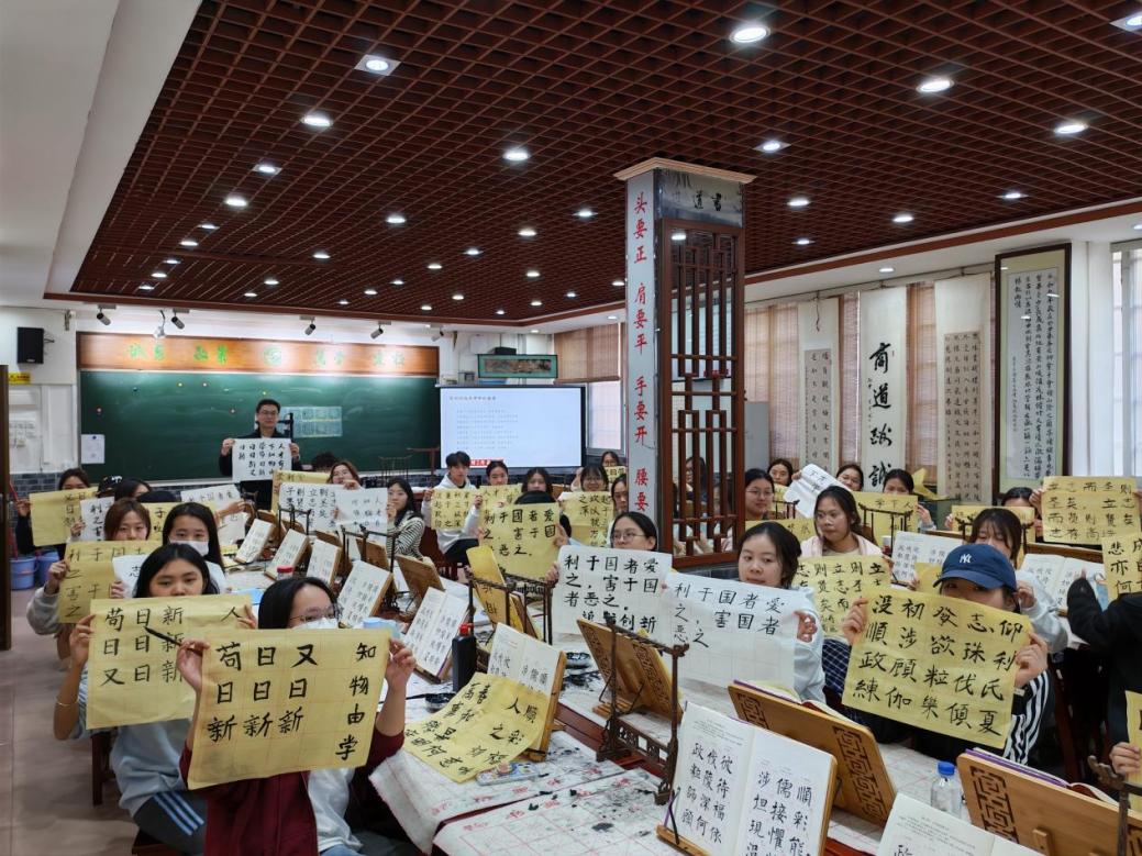 为让阅读分享更具感染力,现场特别设置了书法实践环节。李繁带领同学们挥毫泼墨,将总书记勉励青年的 “人才有高下,知物由学”“苟日新,日日新,又日新”等古语落到宣纸上。同学们凝神聚力,或笔力遒劲,或清秀雅致,在笔墨流转间体悟经典内涵与全会精神的共鸣,现场墨香氤氲、气氛热烈。